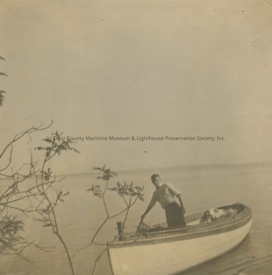 Unidentified young man wearing bowtie in a skiff.
