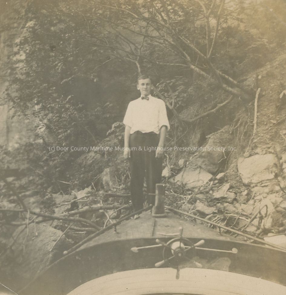Young man in bowtie stands on shore after landing motor skiff.