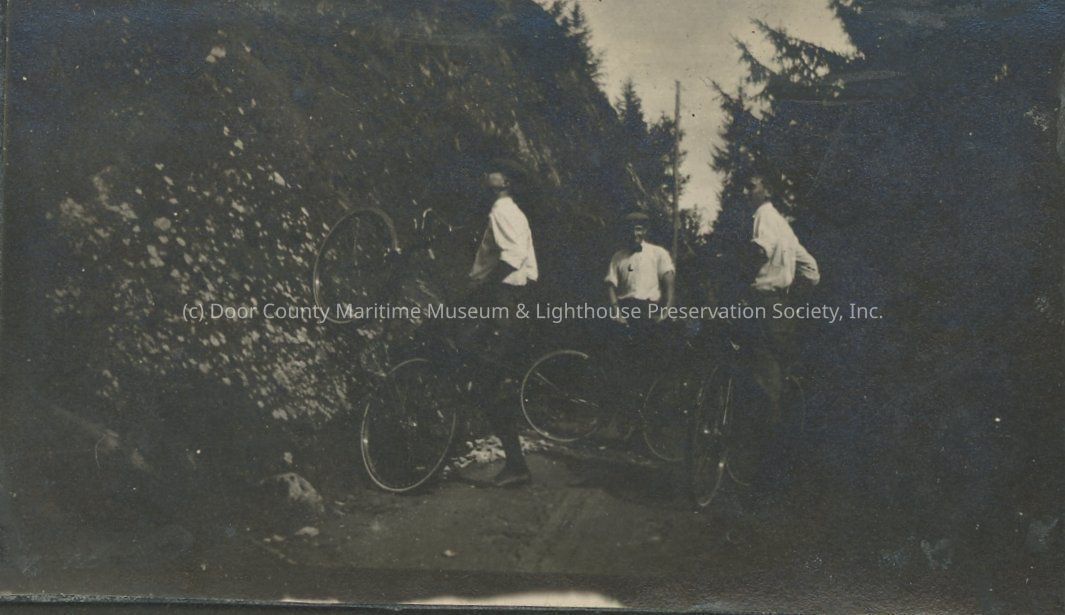 Three unidentified young men with bicycles pose for camera on trail.