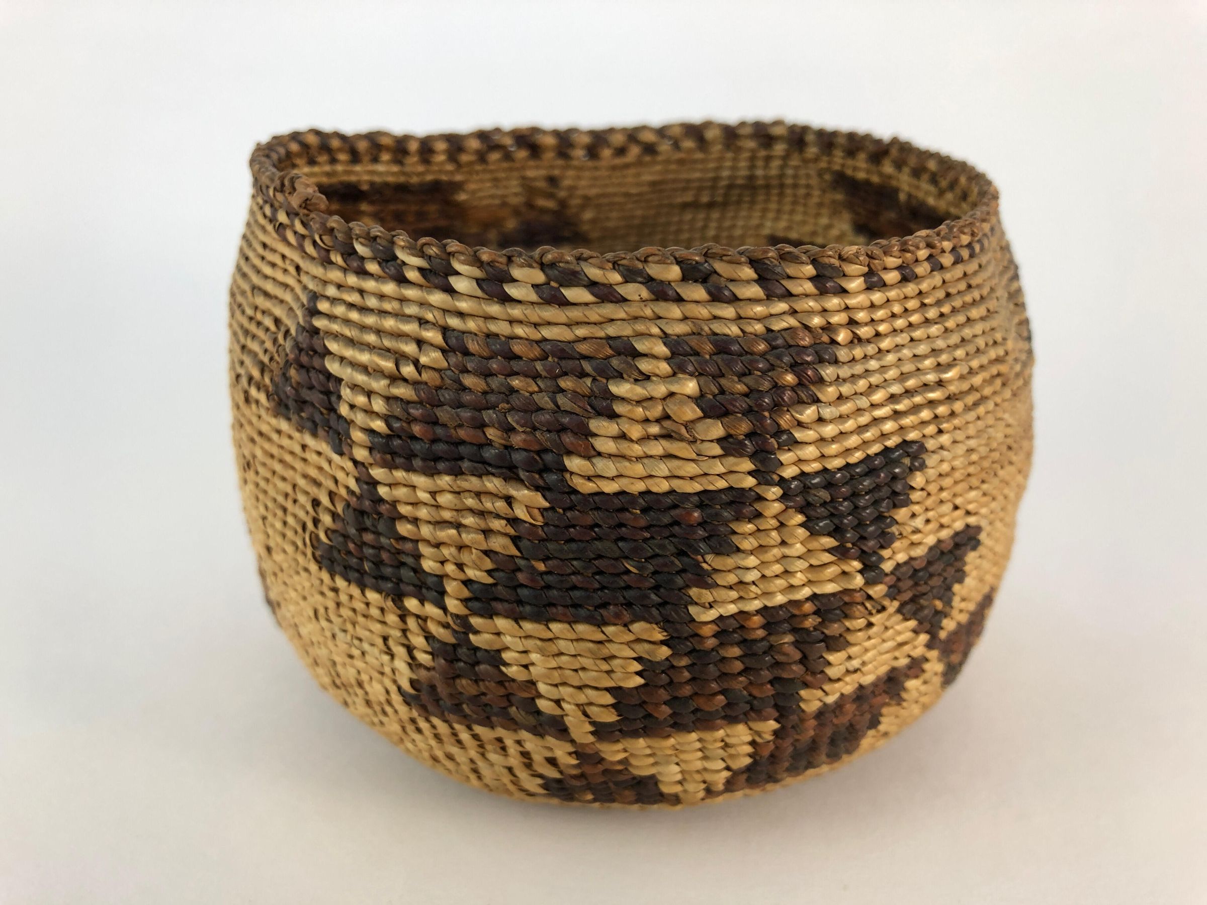 Primarily plain twining, but approx. the first inch from start is three strand, and there are two rows of three strand reinforcement just where the flat base begins to flare upward. Full twist overlay design.