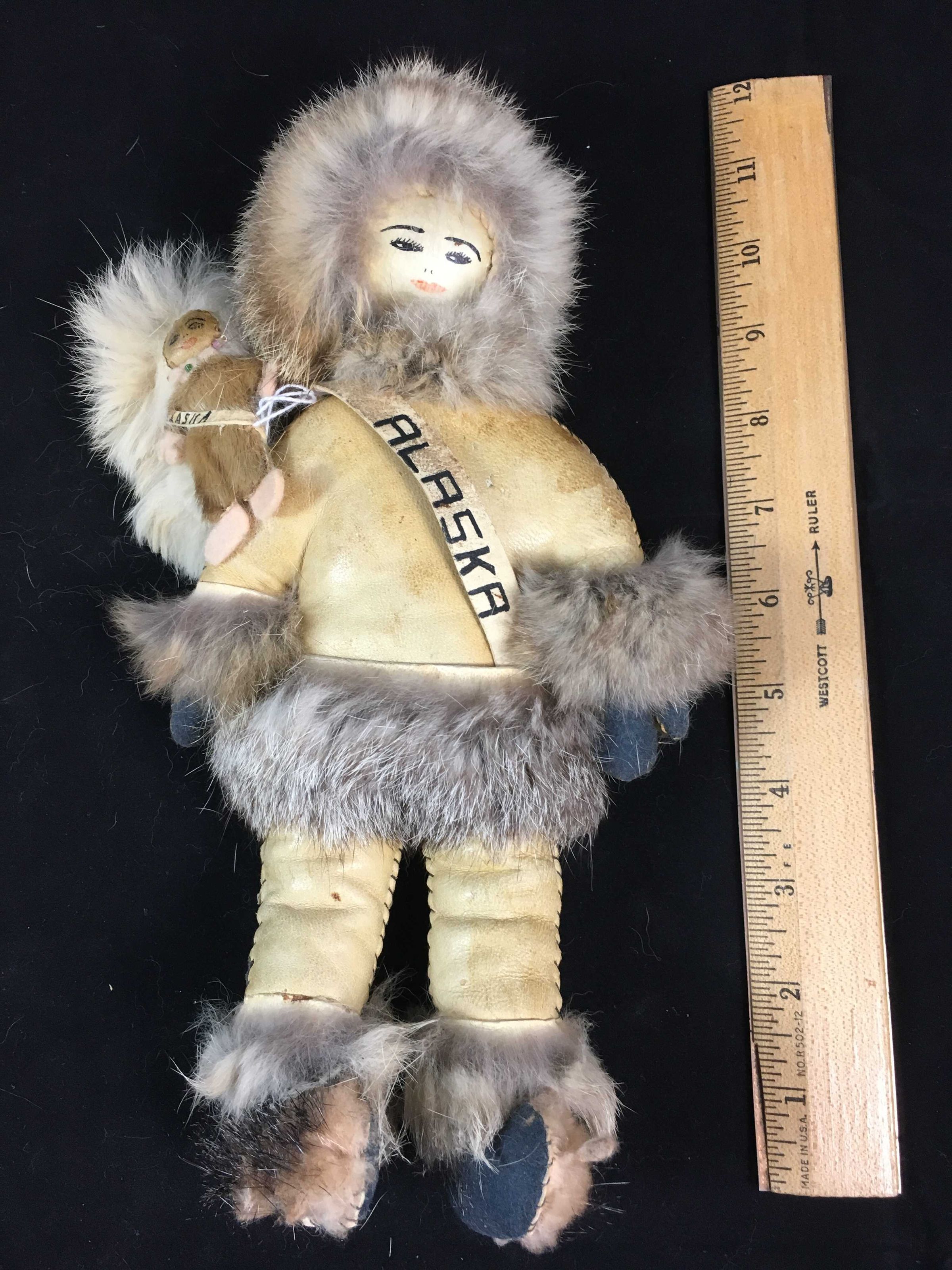 The adult's face is hard material, possibly leather, with the face delicately painted on with black and red ink. The adult's body is leather sewn with black thread and stuffed with unknown material. The adult wears a fur hood, fur cuffs, and fur around the waist and ankles. She also wears gloves with seal fur on the outside and black felt on the inside and boots with unknown fur on the outside and black felt on the inside. The child's body is entirely made of seal skin with the light tan fur on, but with the face area shaved and features painted on with black and red ink. She wears a hood of long whitish animal fur. The baby has a pink felt collar held with a single green bead in the center and wears two pink bead earrings. The baby's hands and feet are pink felt.