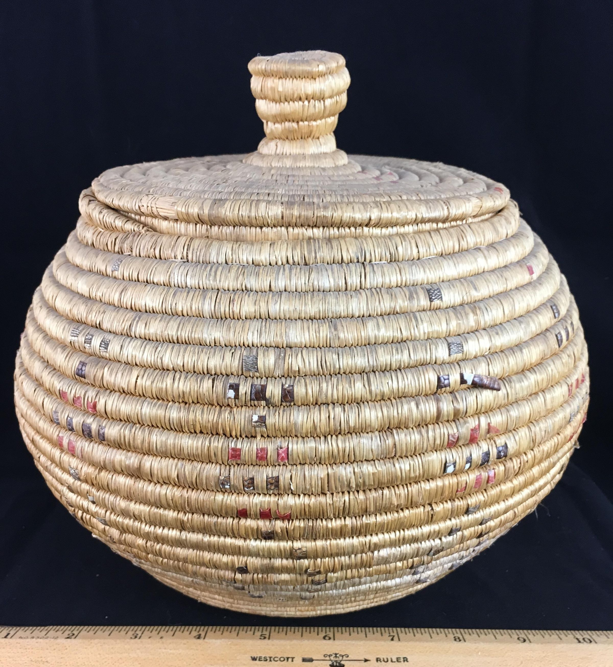 Great old Alaskan basket decorated with dyed bird leg skin and seal gut beading. The interior has a pink polyester cloth lining sewn on apparently to make it into a sewing basket.