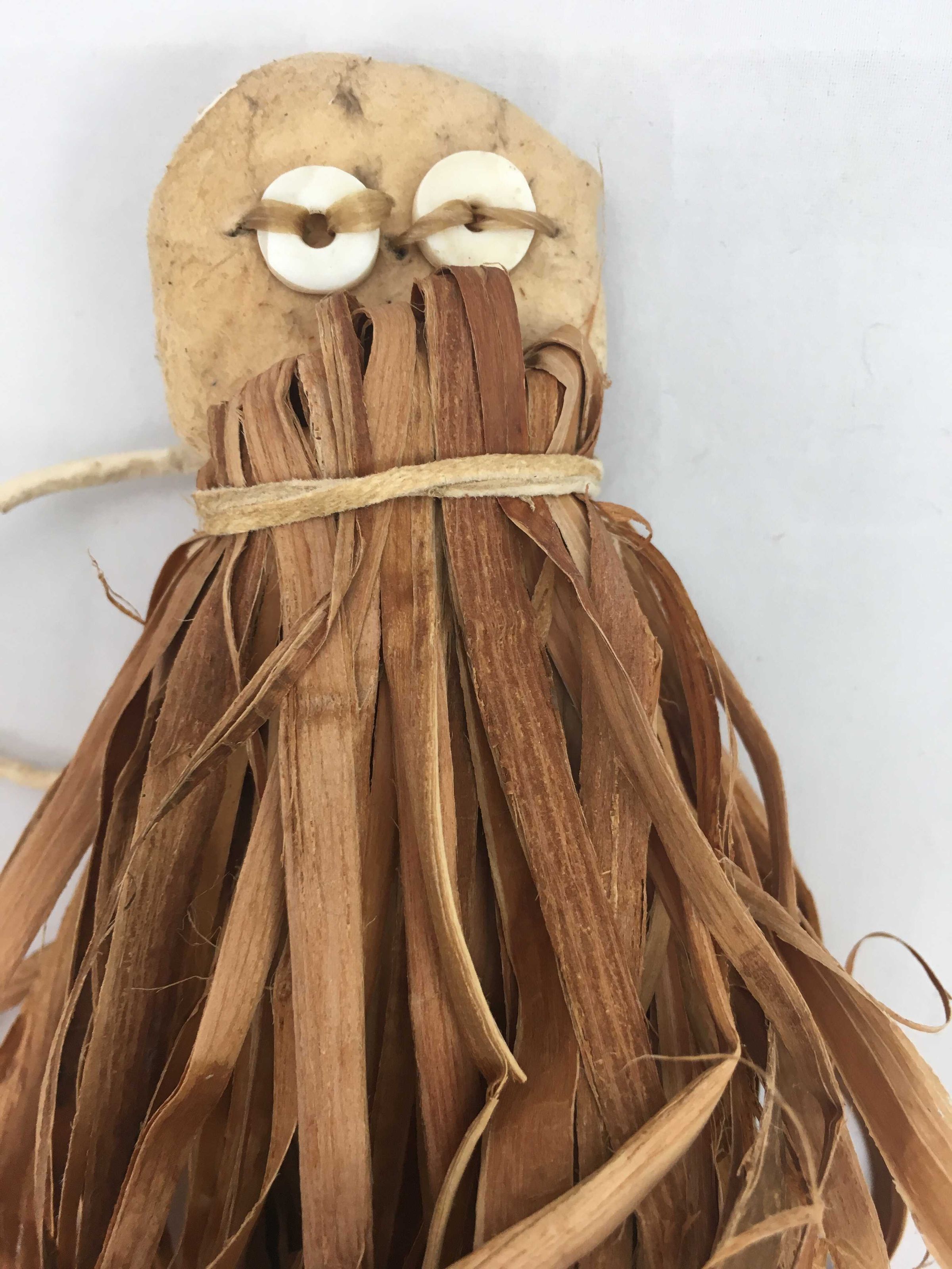 The doll's body is carved from a slat of incense cedar wood covered with a piece of tanned hide. The clamshell disk eyes are sewn on to the leather with sinew. The body is wrapped with long strips of the inner bark of big leaf maple, tied to the body with a thong of tanned hide.