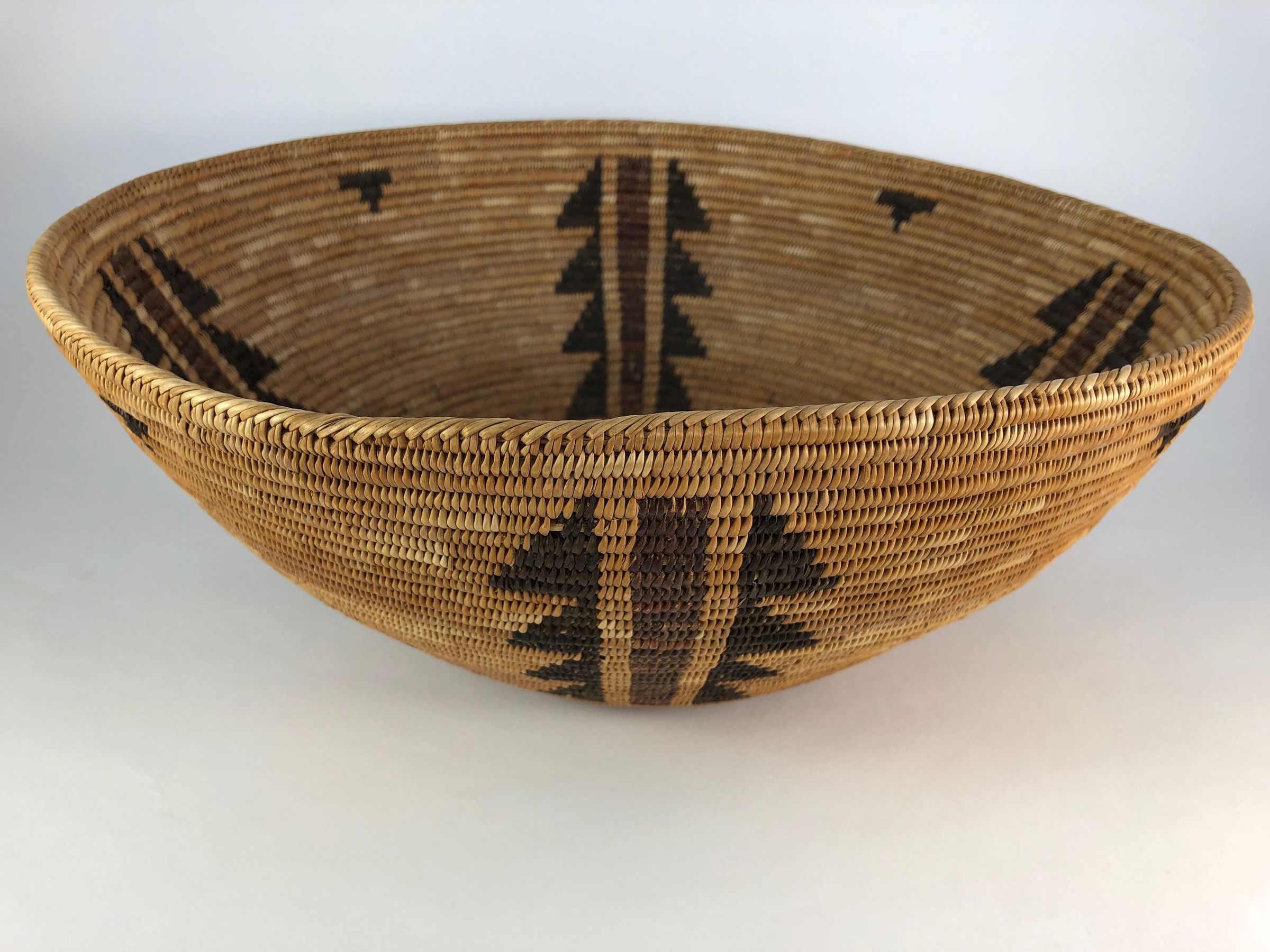 Bowl-shaped basket with tight and even weave. Background of sedge and design elements of bracken fern and redbud. It has four primary design elements consisting of stepped triangles in bracken fern on either side of a bar of redbud. Two coils below the rim are small stepped bar designs in bracken fern spanning three coils.