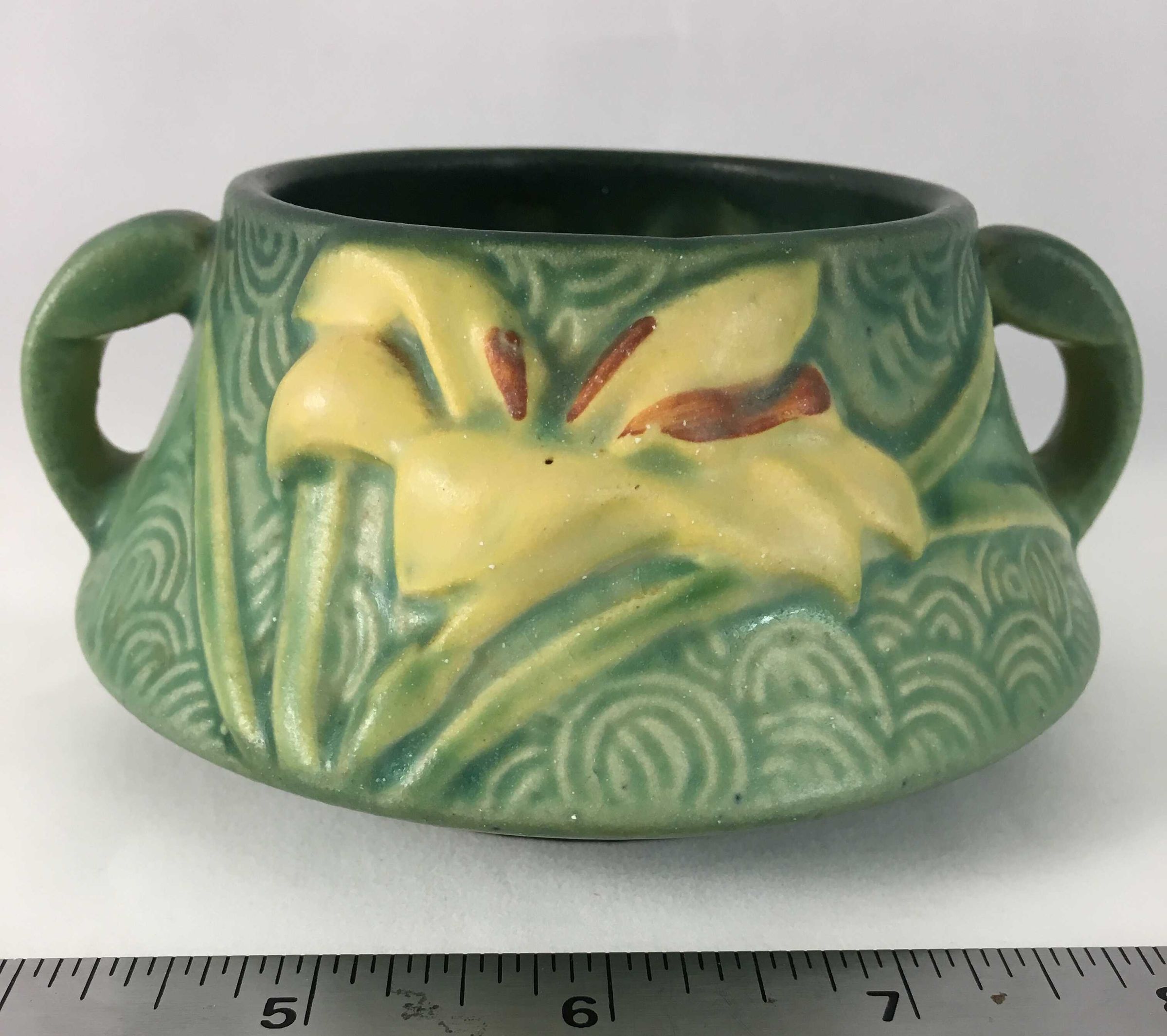 Roseville green two handled zephyr lily sugar bowl with yellow lily on one side and a pink lily on the other side.Made/Created