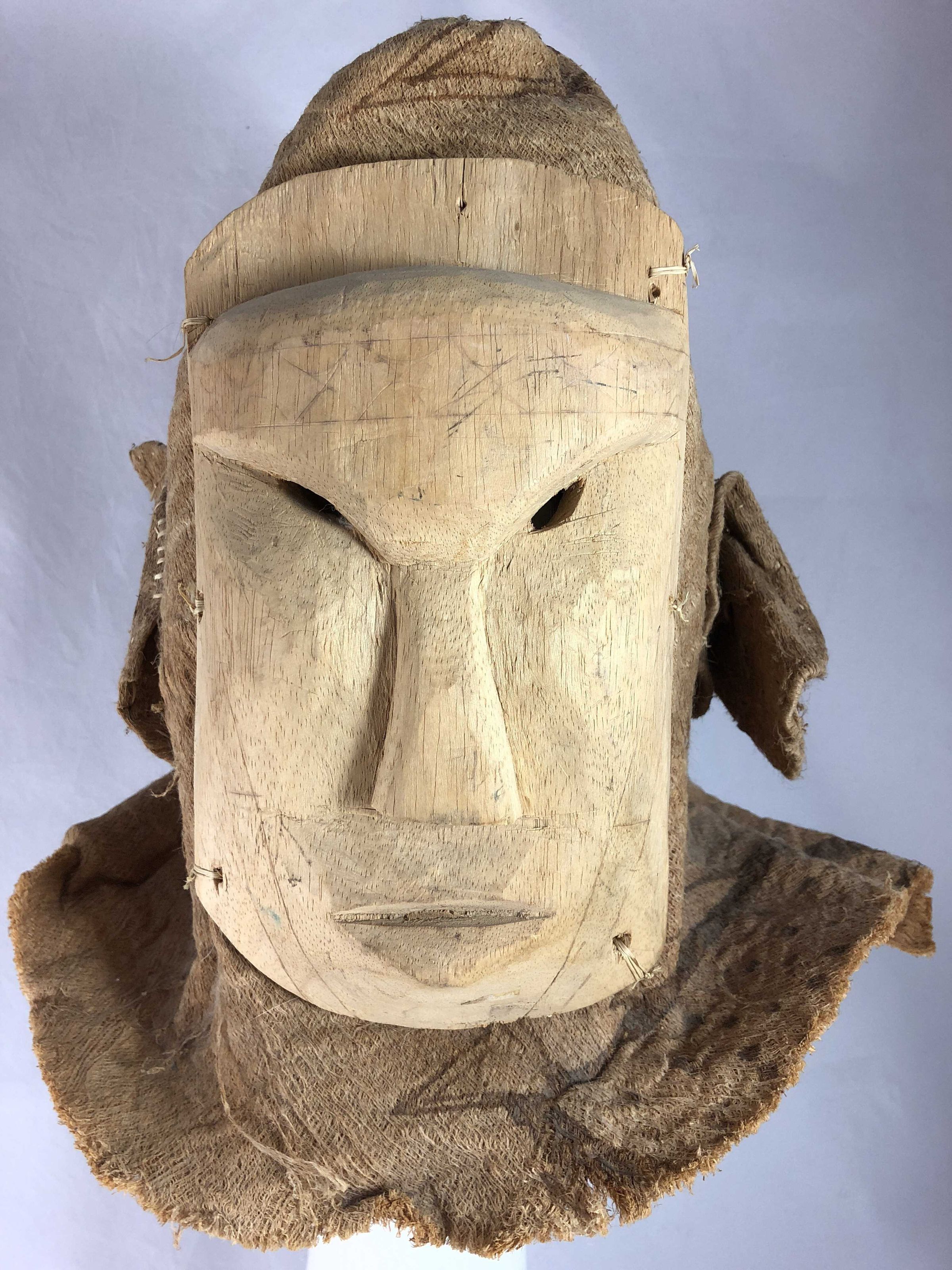 During a funeral ceremony, dancers (all men) wear masks like this one. The bark cloth hood usually goes over the top of a dancer’s head and the mask rests on his forehead so that he can see through the porous cloth or through the eyes of the carving. Dimensions
