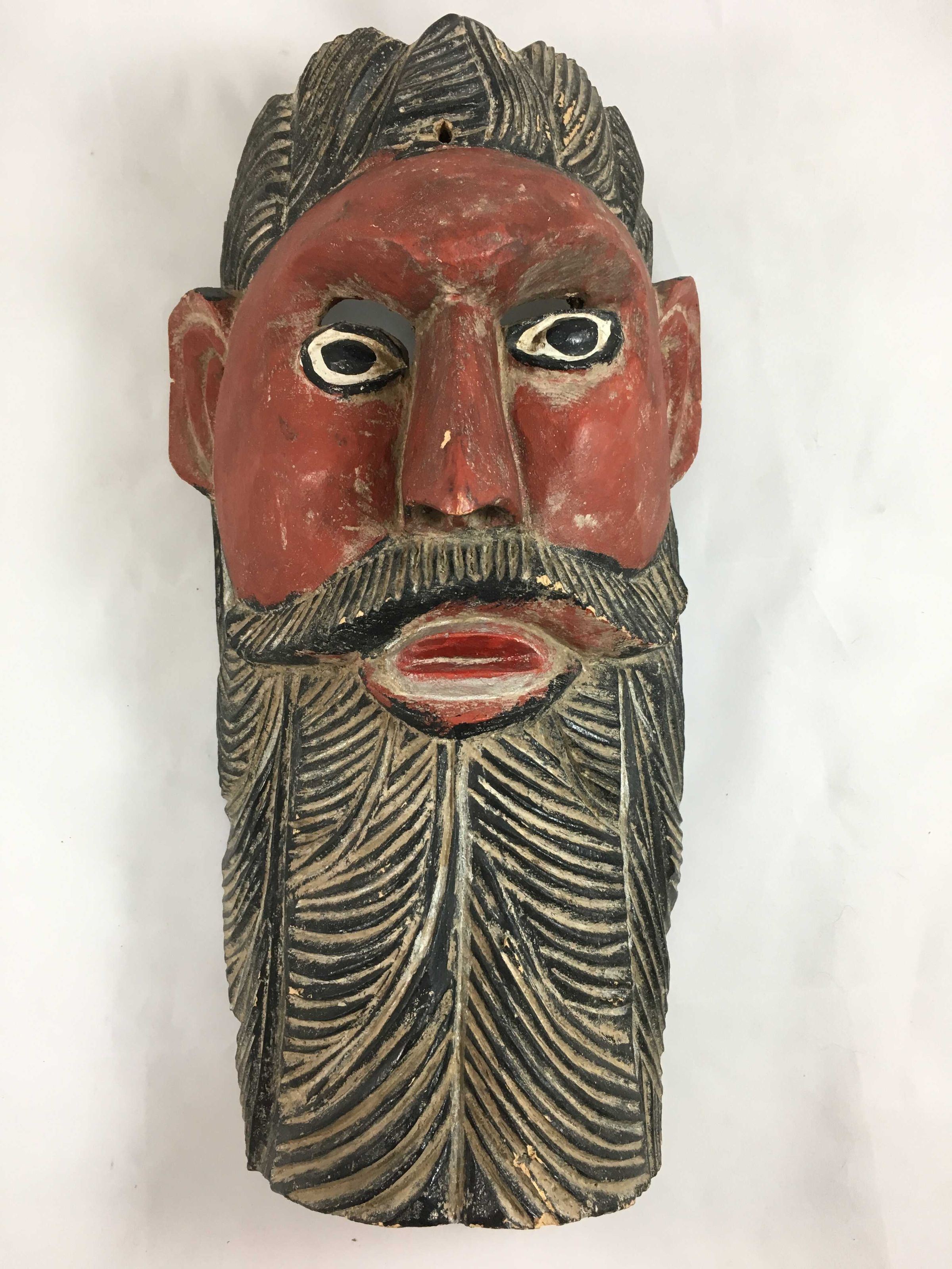 Tall processional mask from Guerrero, Mexico depicting a bearded man with a red face, black hair and a black beard.Ethnography