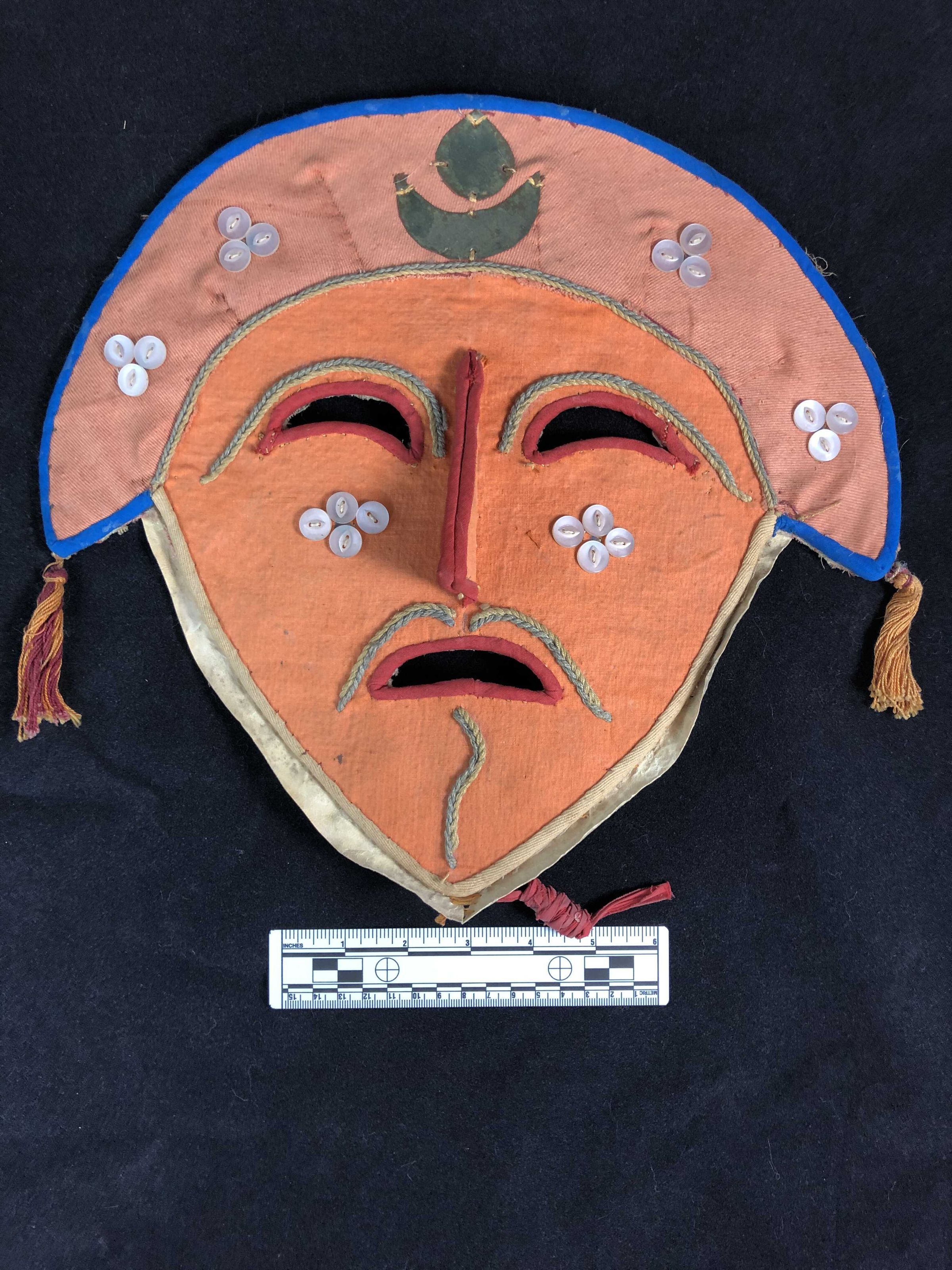A traditional Tibetan opera mask, depicting a face with a possibly sorrowful expression. The mask has a vivid orange cloth base glued on a stiff cardboard with accents in blue and white, embellished with white buttons and orange and red tassels. The curved eyebrows, wide eyes, and downturned mouth contribute to its dramatic effect, while a metalic crescent moon adorns the forehead (or headpiece?), adding a mystical aspect.
