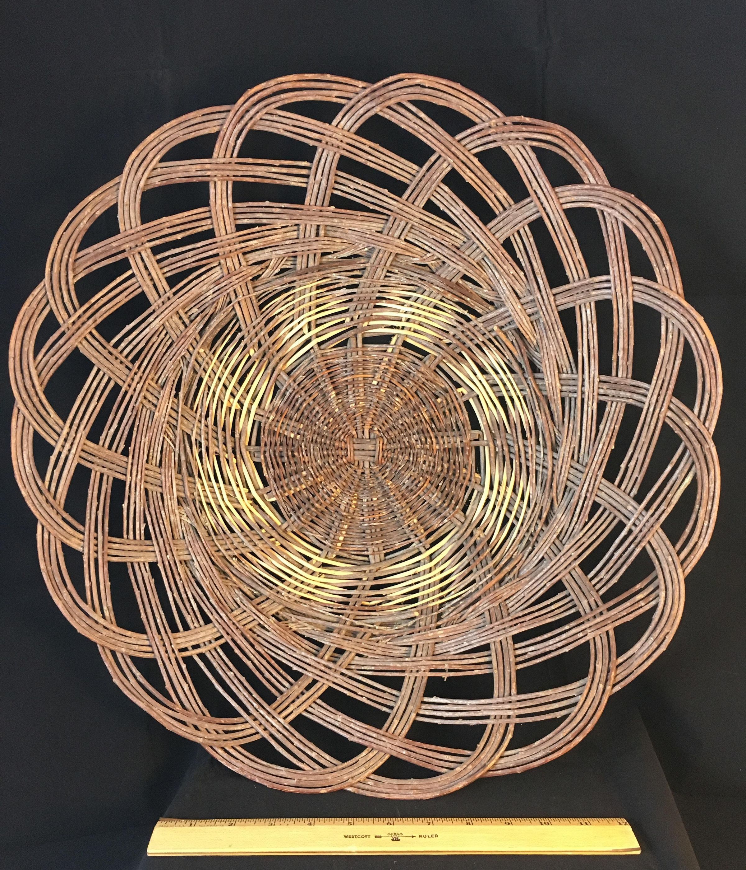 Beautiful Pueblo willow tray woven with primarily unpeeled willow, but with several strands of peeled willow creating a light colored circle about one third from the start.