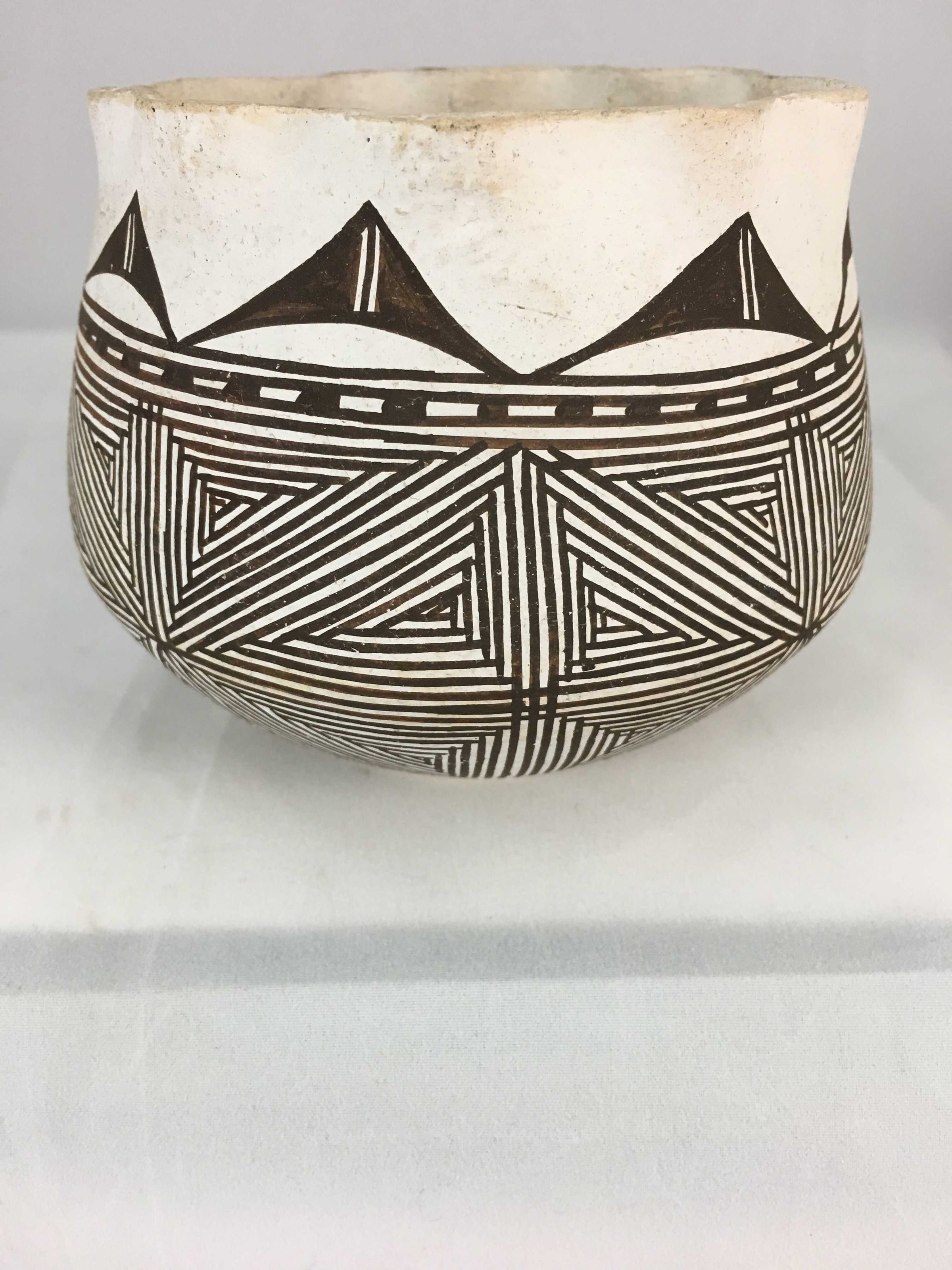 Nice little black on white pot with detailed geometric designs. It is is good shape with one minor spall in the lower quarter.Ethnography