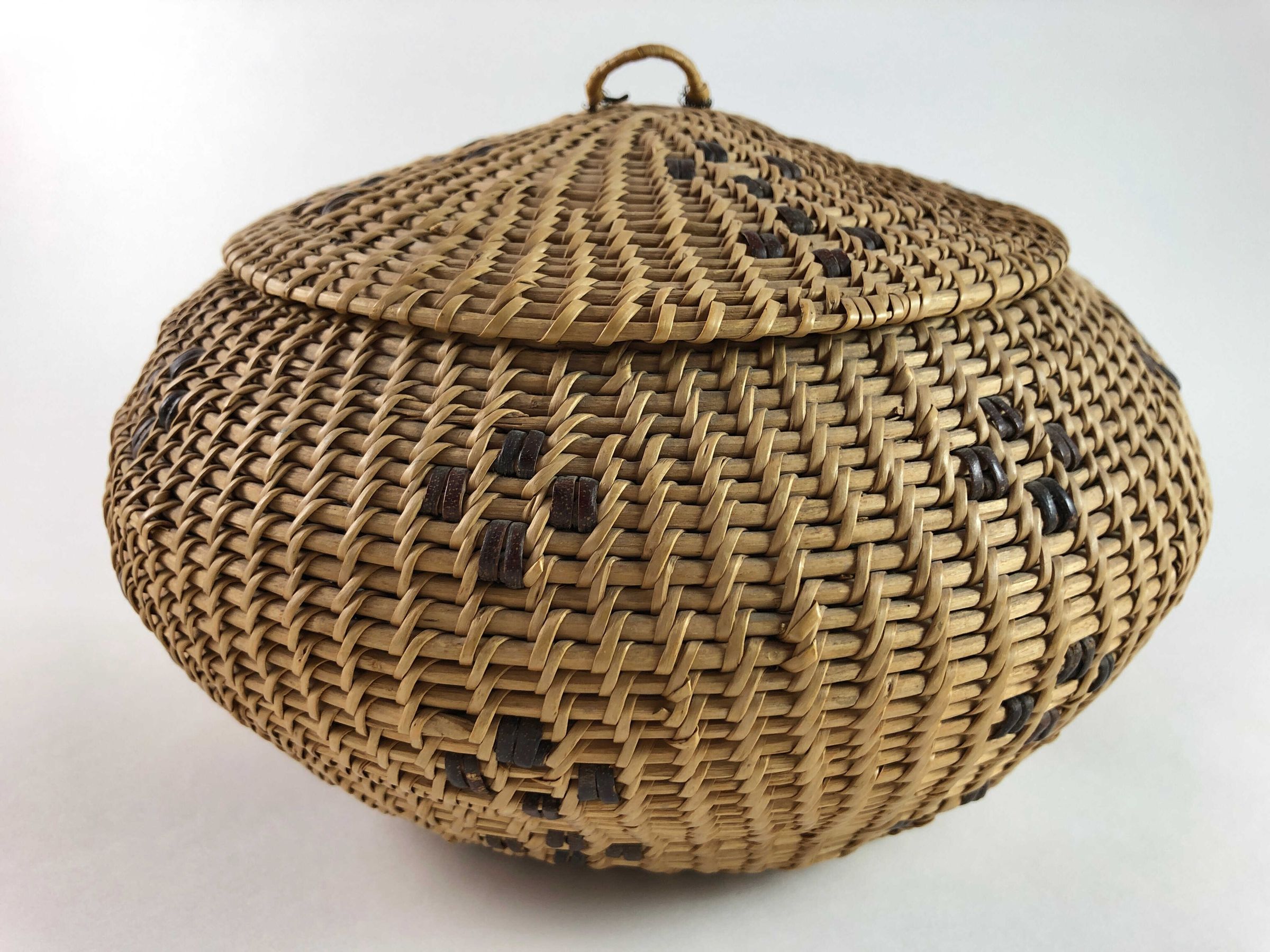 Very nice old single rod basket decorated with designs consisting of four squares each of redbud. The lid has a round ring of willow that appears to have been coiled over copper wire.