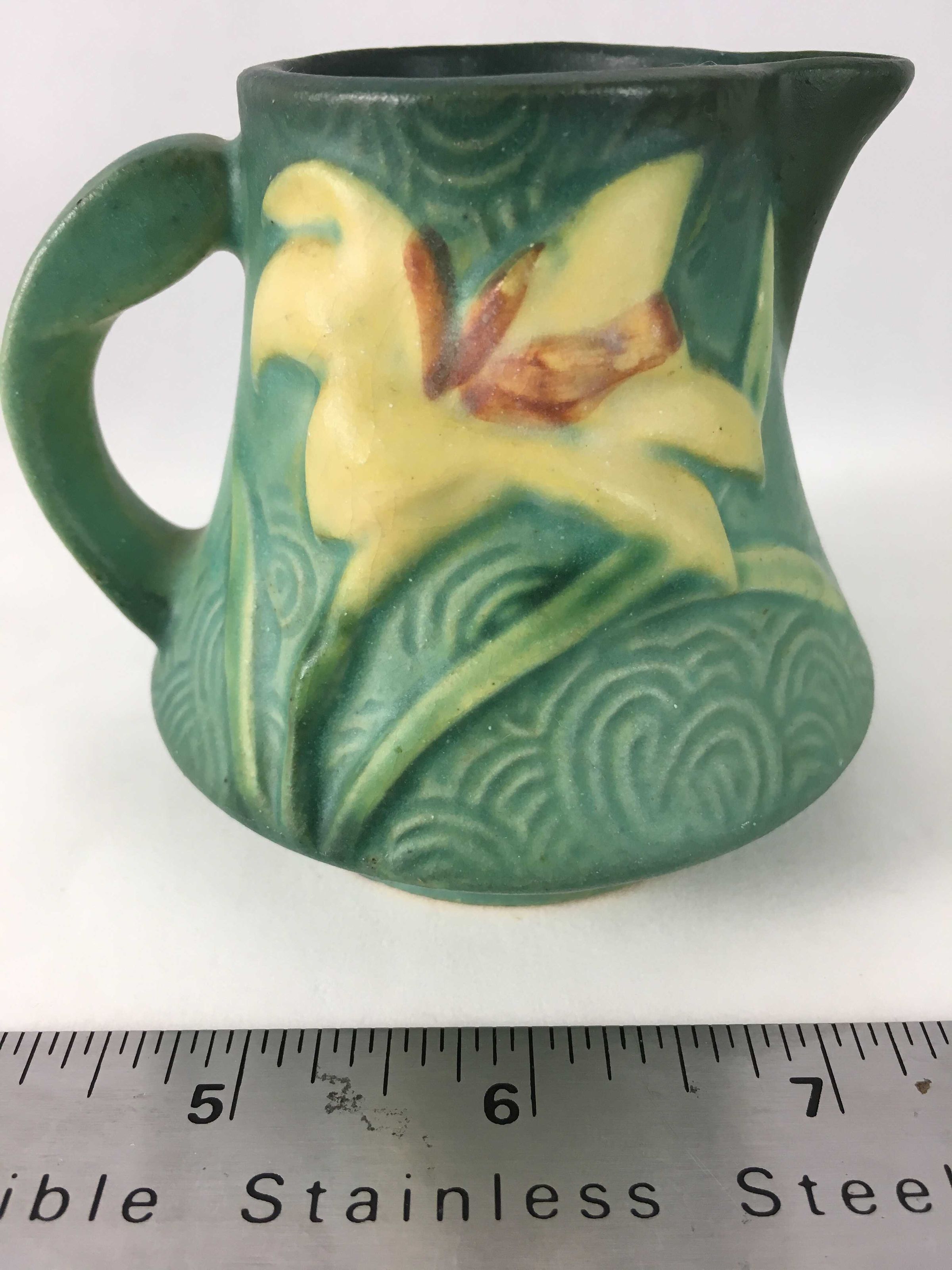 Roseville green handled zephyr lily creamer, with a yellow lily on one side and a pink lily on the opposite side.Made/Created