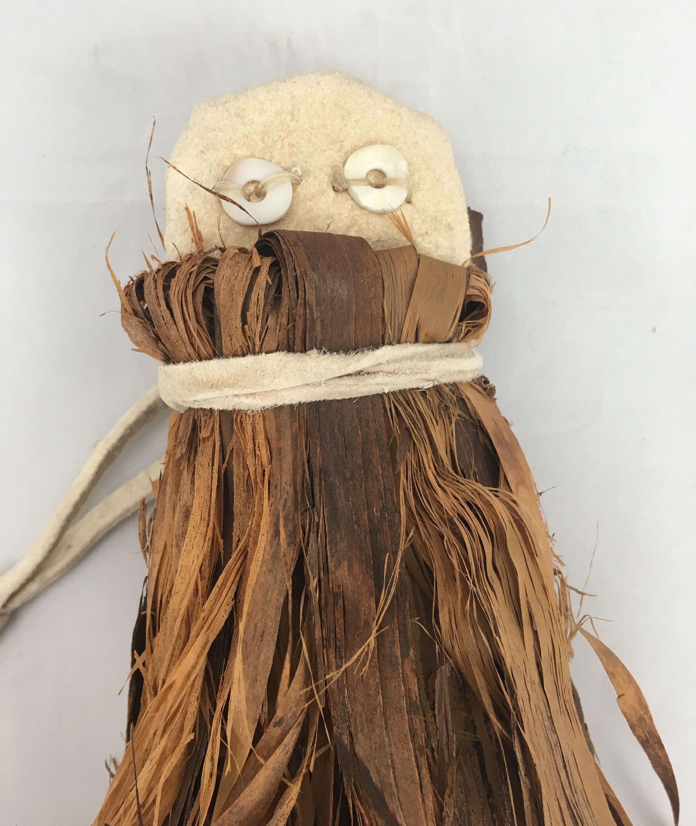 The doll's body is carved from a slat of pine wood, covered with a piece of tanned hide. The eyes are clam shell disks sewn on to the leather. The body is wrapped in long strips of incense cedar bark tied on with a thong of tanned leather.