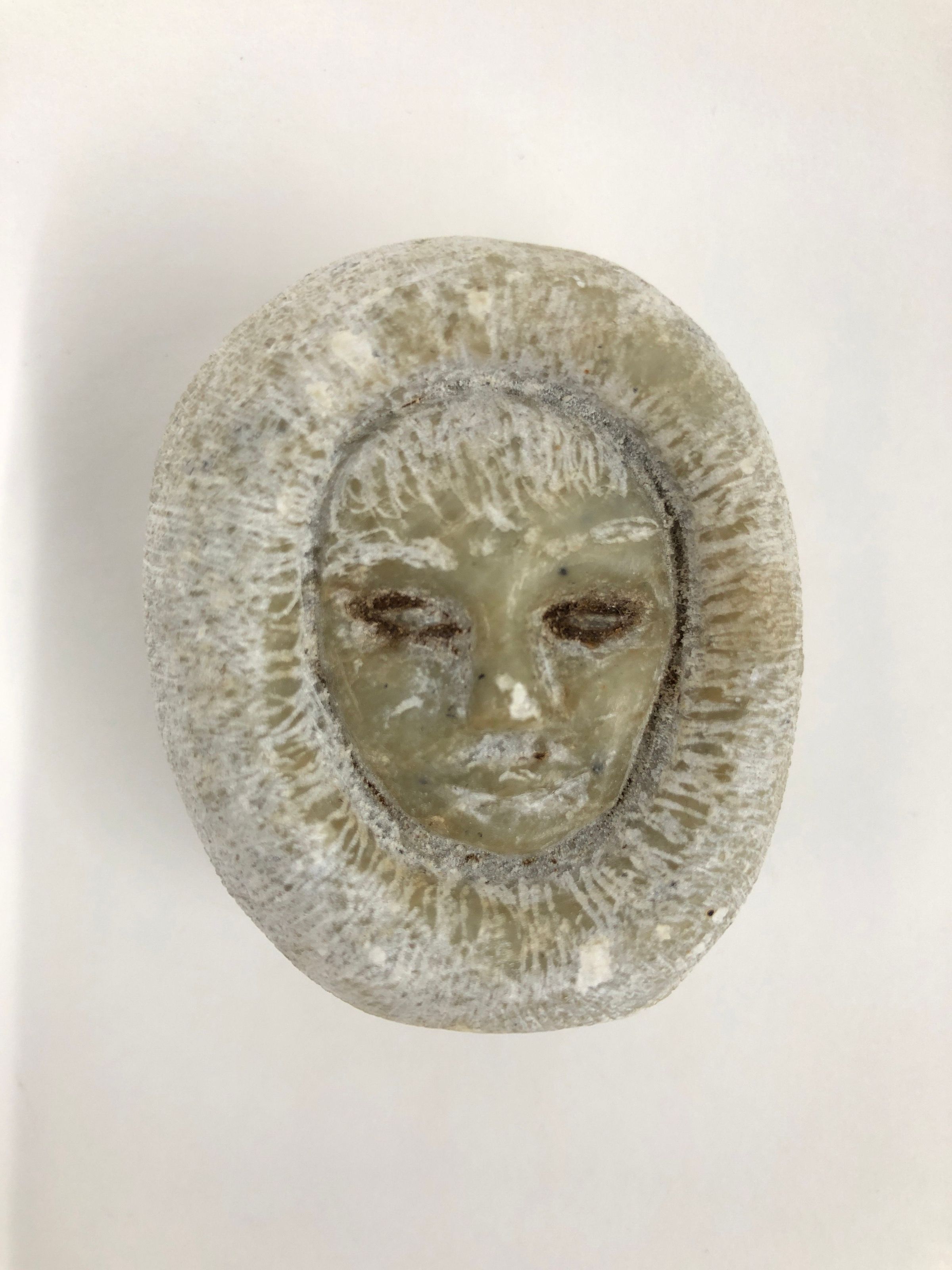 Stone carving of a head, the face visible in the hood of a parka. The eyes of the face have been painted with a reddish pigment.Type of Sculpture