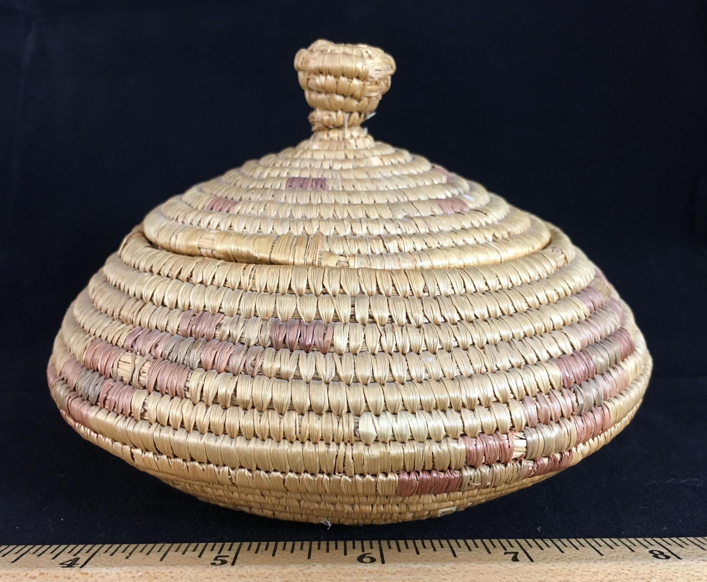 Small lidded basket with a prominent knob on top. Missing several stitches around the body. Colors on the exterior are fairly faded. Top knob was partly pulled off and has been somewhat stabilized with thread.