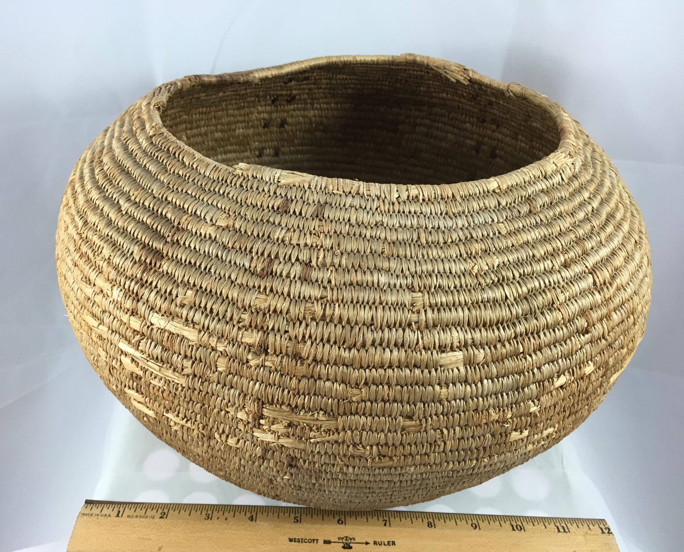 Old, well used basket from the Arctic. The simple designs, consisting of six sets of parallel lines of two brown dots rising up the sides of the basket are faded but still visible from the exterior but can be readily seen on the interior.