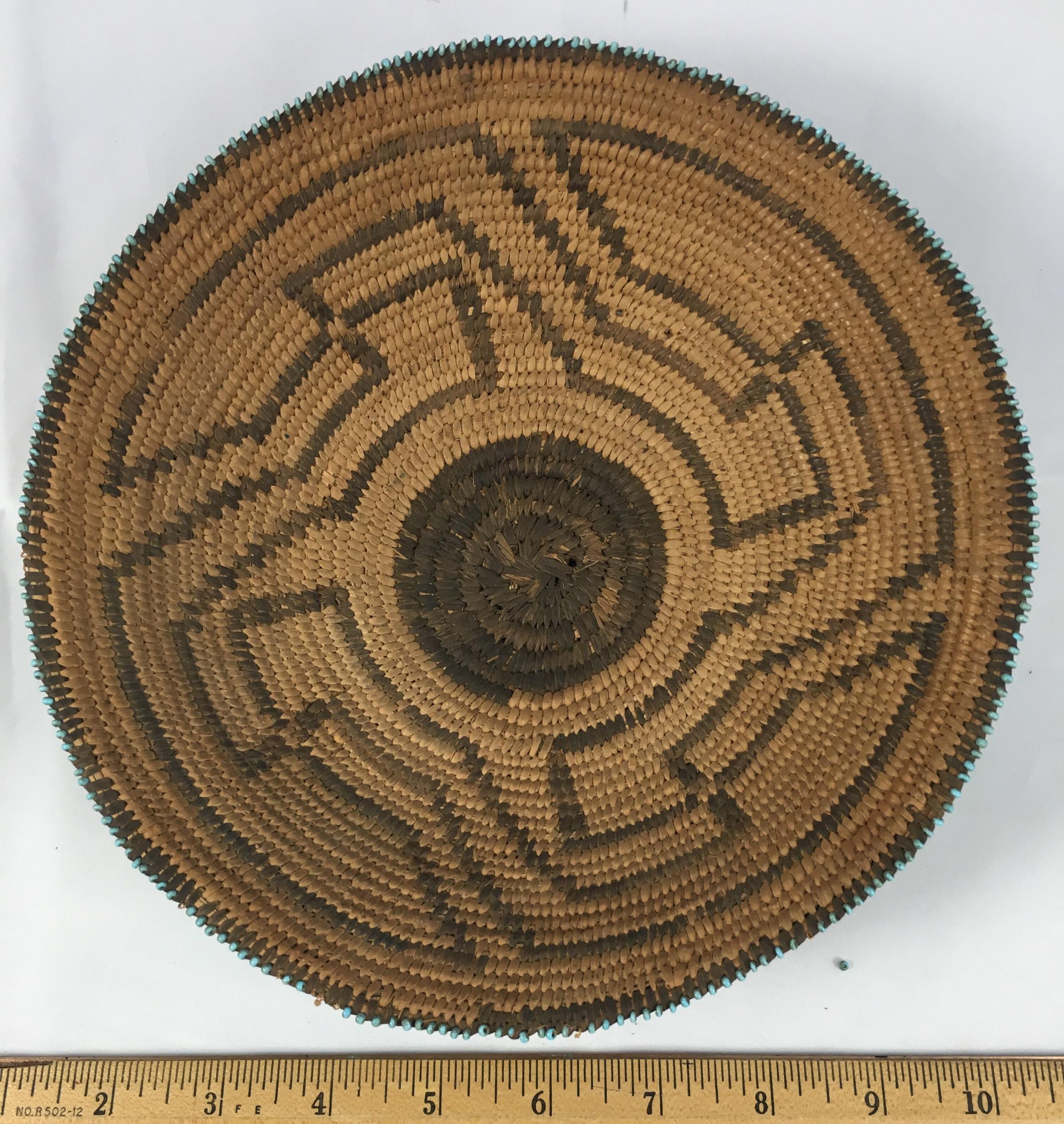 Beautiful little old Pima tray, with the rim decorated with tiny turquoise glass beads.