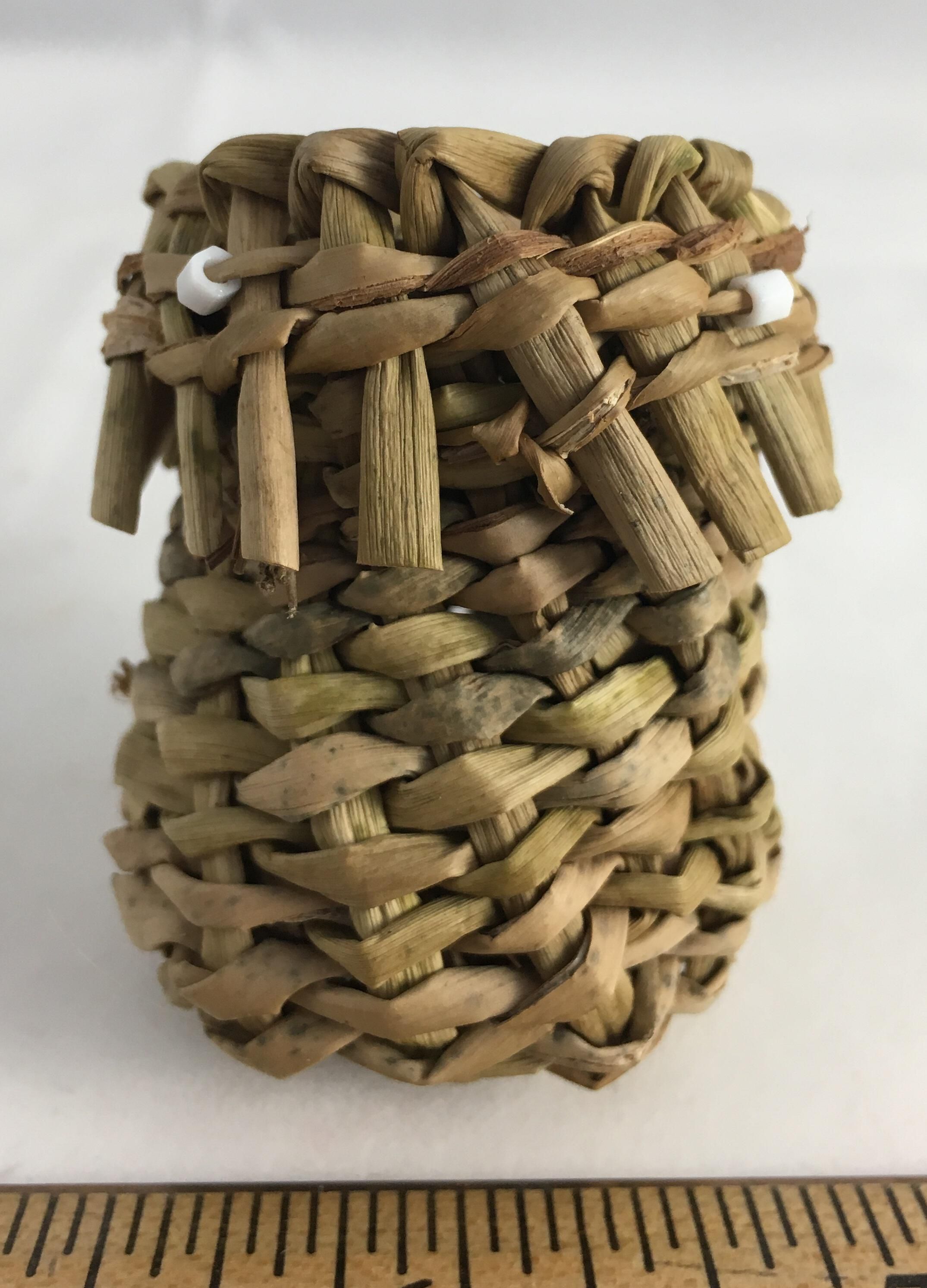 The warp strands are bent at nearly 180º, then two rows of additional twining were added, incorporating the four white glass beads in the first row.