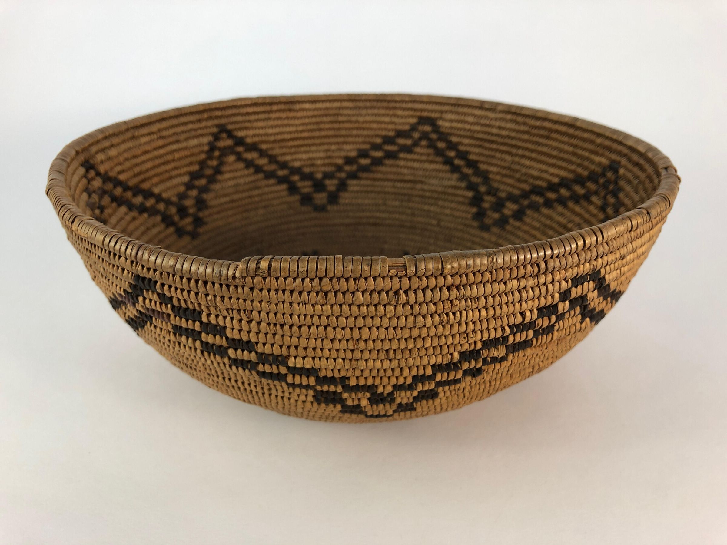 Beautiful Paiute bowl with the designs primarily in bracken fern. There are two small areas where redbud was used instead of bracken fern near the peaks of two of the adjoining triangle zig-zags.