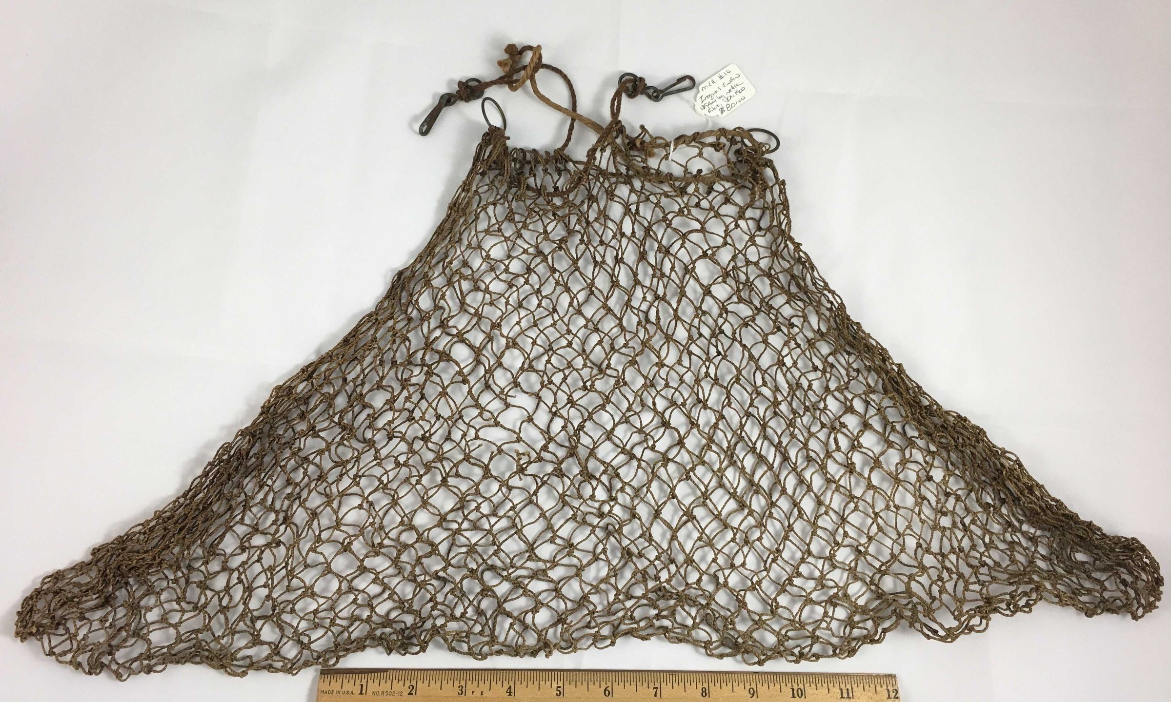 Neat old triangular-shaped Iroquois game bag made of knotted nettle fiber cordage. The cordage is made of two strands spun together. Per the seller, it is circa 1900. Considering its age and that it was likely used a fair bit, it is in good shape. There are a couple of small tears.Ethnography