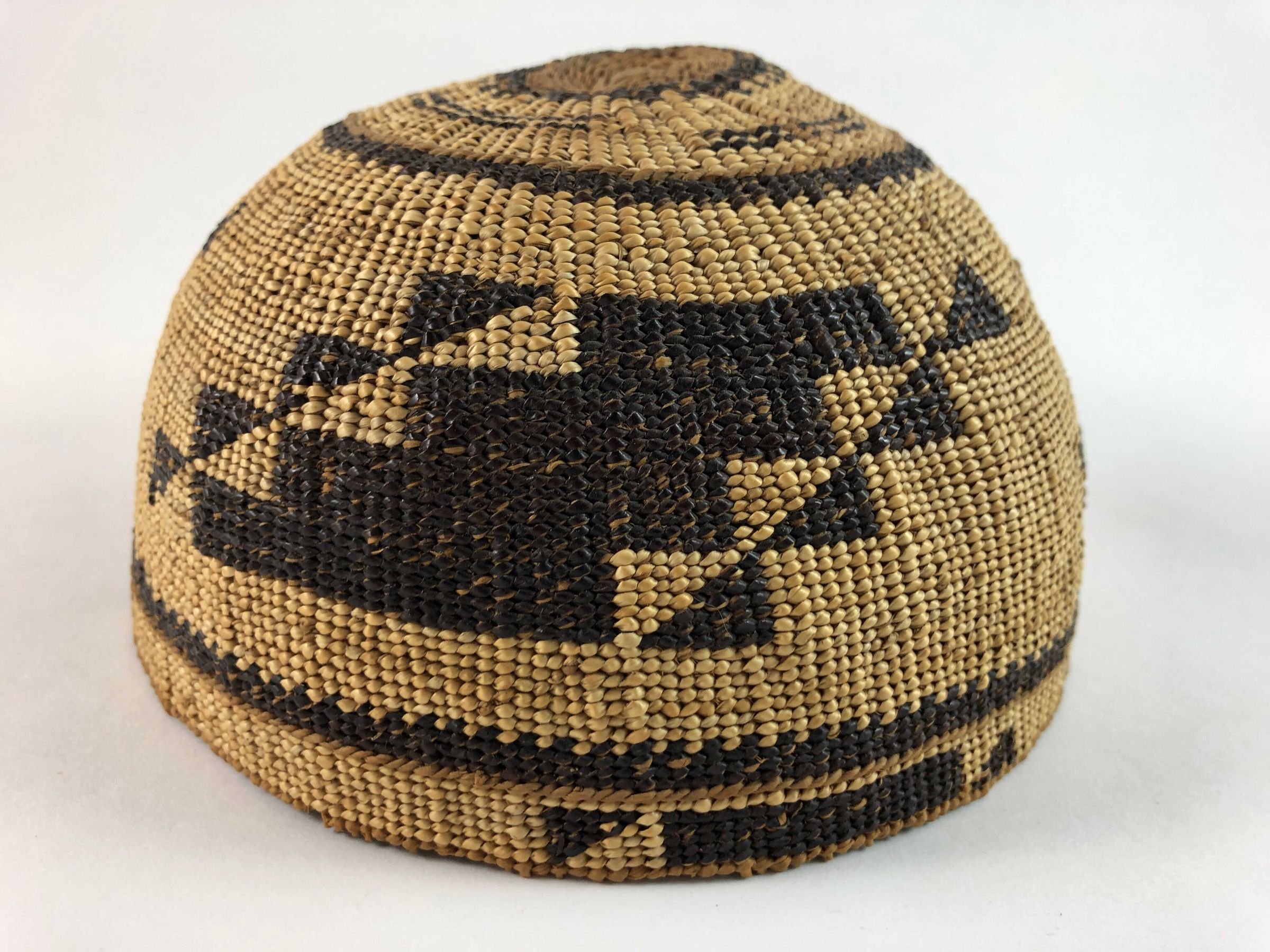 There are two rows of three strand twining- one about 1/2" up from the rim and another approx. 1 3/4 from the start. Half twist overlay.