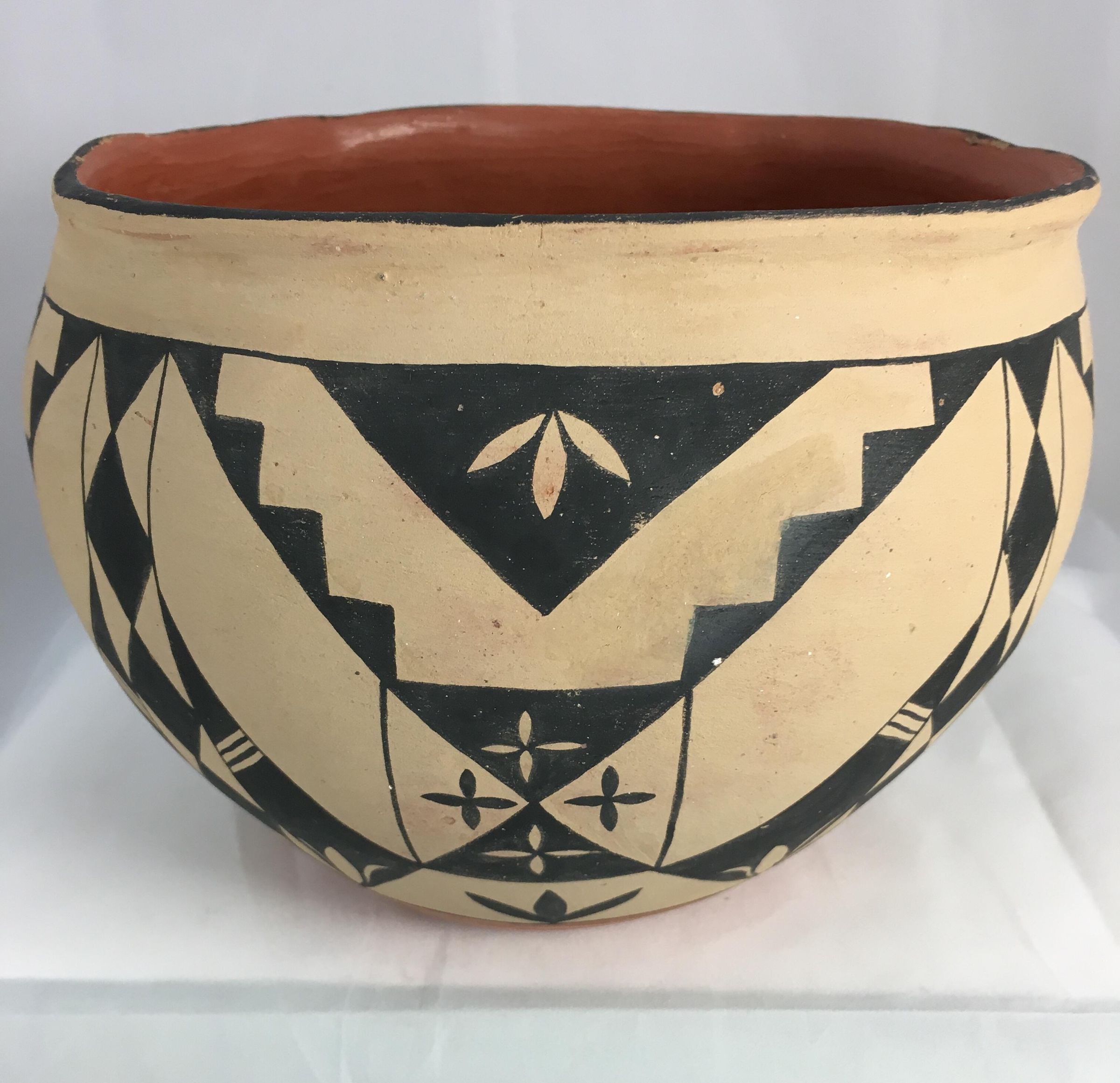 There is a faint etching in the base of "V. Montano San Felipe". This is likely Vanencia Montano (Ortiz), wife of Frank Ortiz and mother of noted potter Ricardo Ortiz.Dimensions