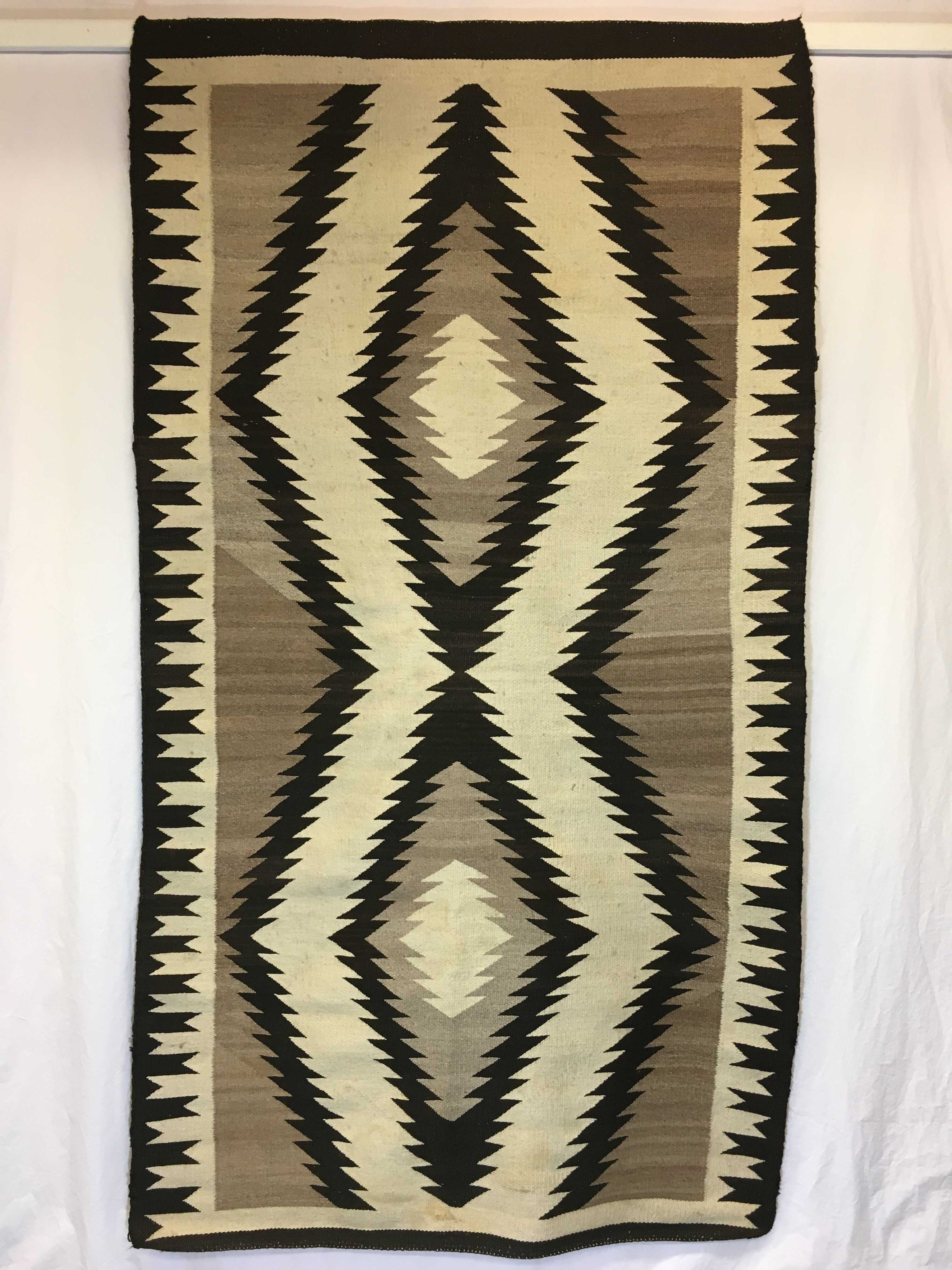 A fairly simple rug with a complex serrate border and the double diamond design created with bands of stacked parallelograms in the center in natural wool colors of black (or dark brown), white and grey. Navajo Rug Textile Details