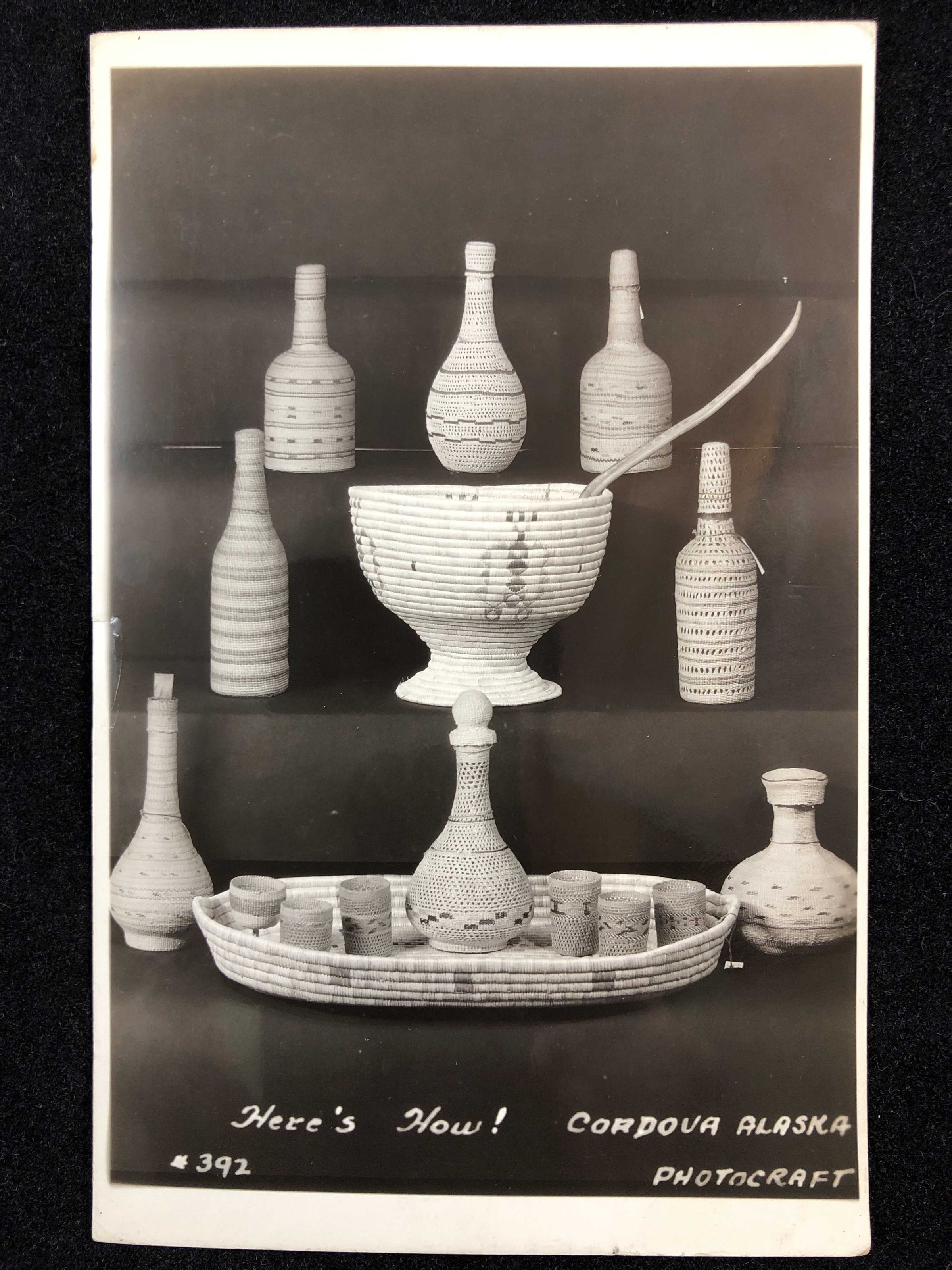A black and white photograph depicting a number of Native Alaskan baskets, including 7 or 8 twined basketry covered bottles, a large coiled footed bowl basket with a long horn spoon in it, a low oval coiled basket tray, and six twined basket cups of various shapes. The baskets appear to be Tlingit and Yupik, and possibly Attu.Subject Place
