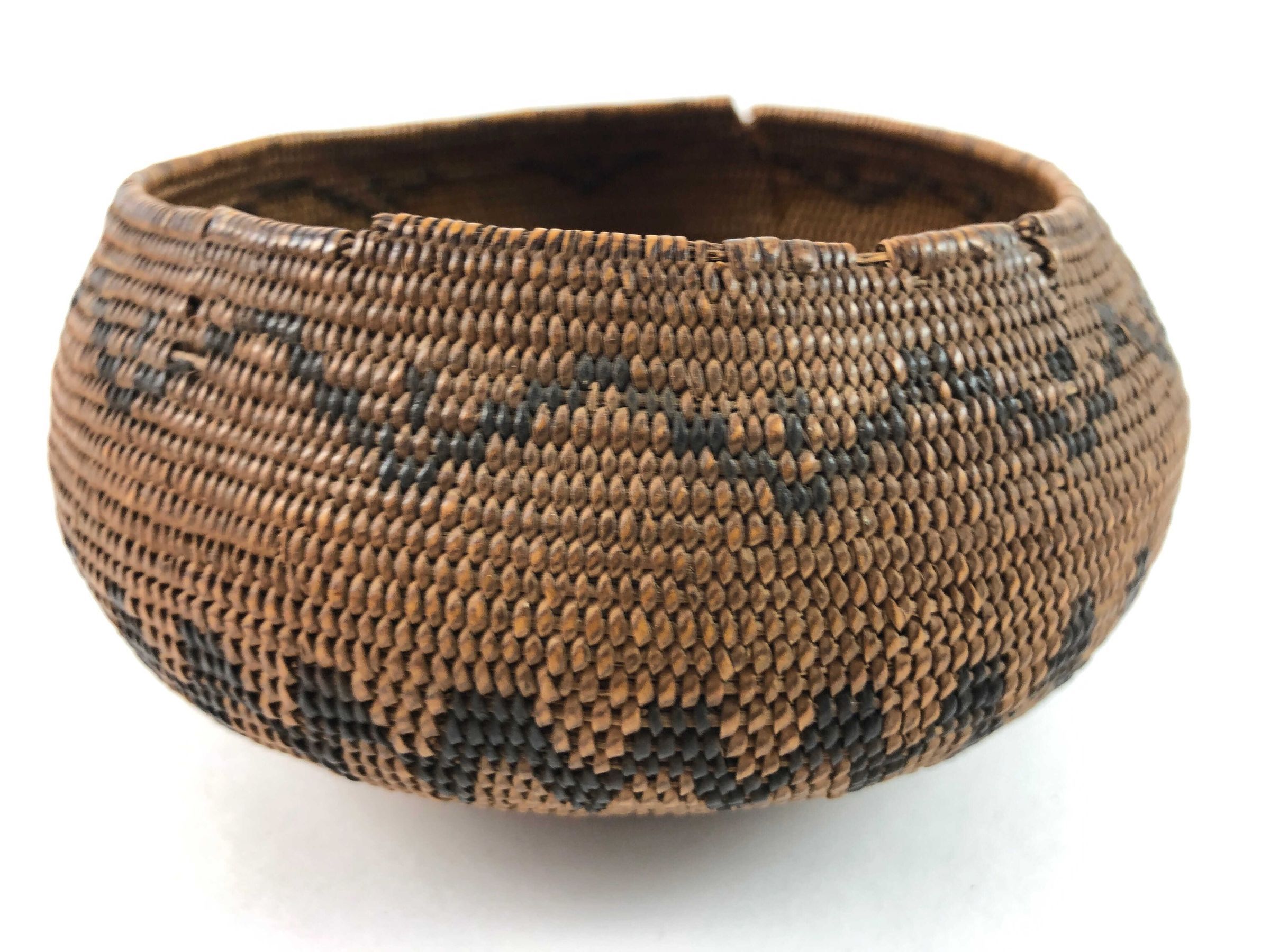 Nice, well made basket- arrow designs close to base (6 on one side, 7 on other), a nearly continuous zig zag line around the middle and a nearly continuous zig zag line near the rim resembling birds, all of bracken fern.