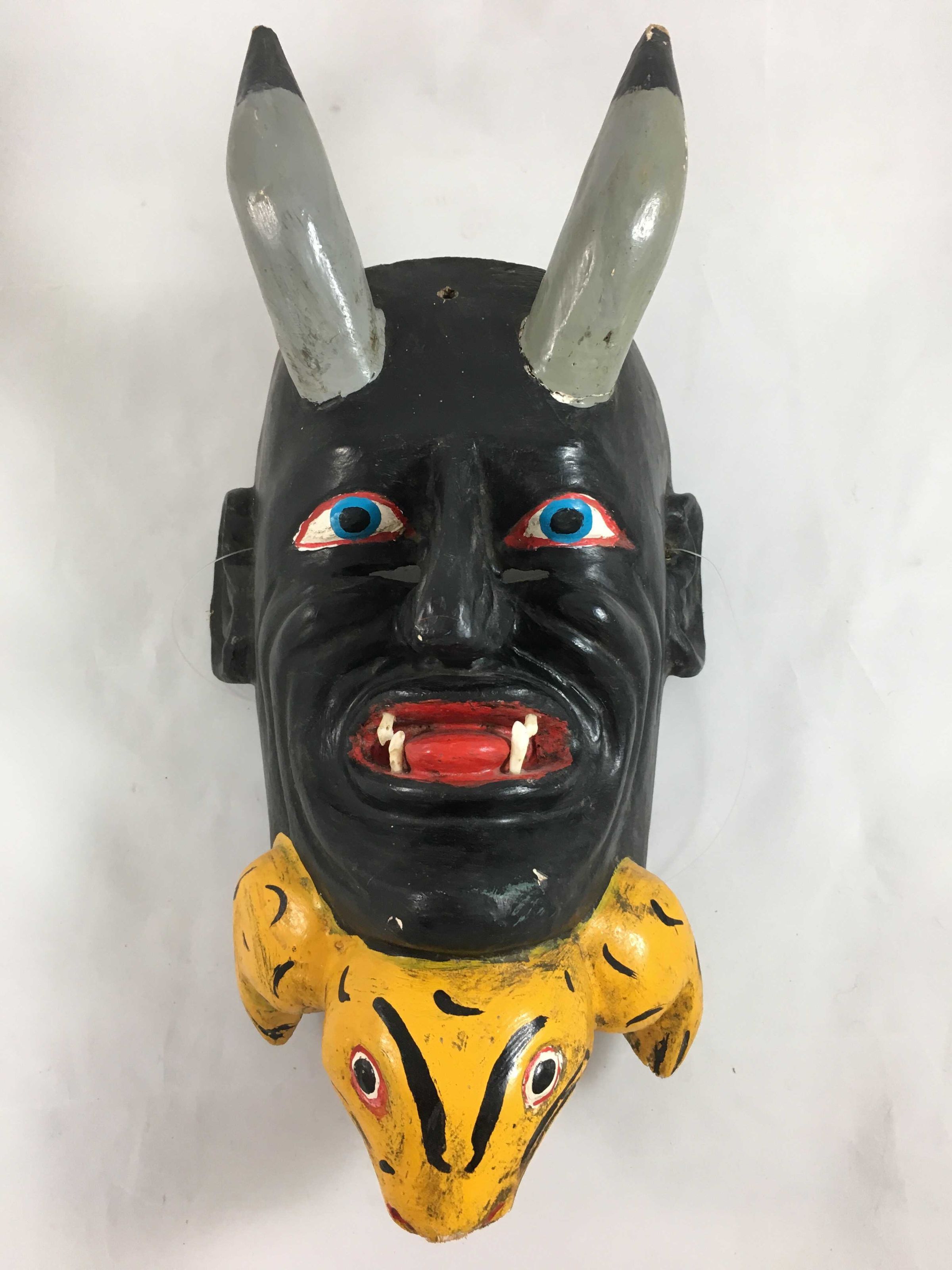 Mask depicting the devil with a black face and tall grey horns, with the bottom portion of the face depicting a jaguar's face and front paws. The eyes are outlined in red, with blue irises and black centers on white backgrounds. The mouth has a protruding red tongue and four animal teeth. The jaguar is yellow with black lines, white eyes outlined in red with large black irises, a red mouth with white painted teeth.Ethnography