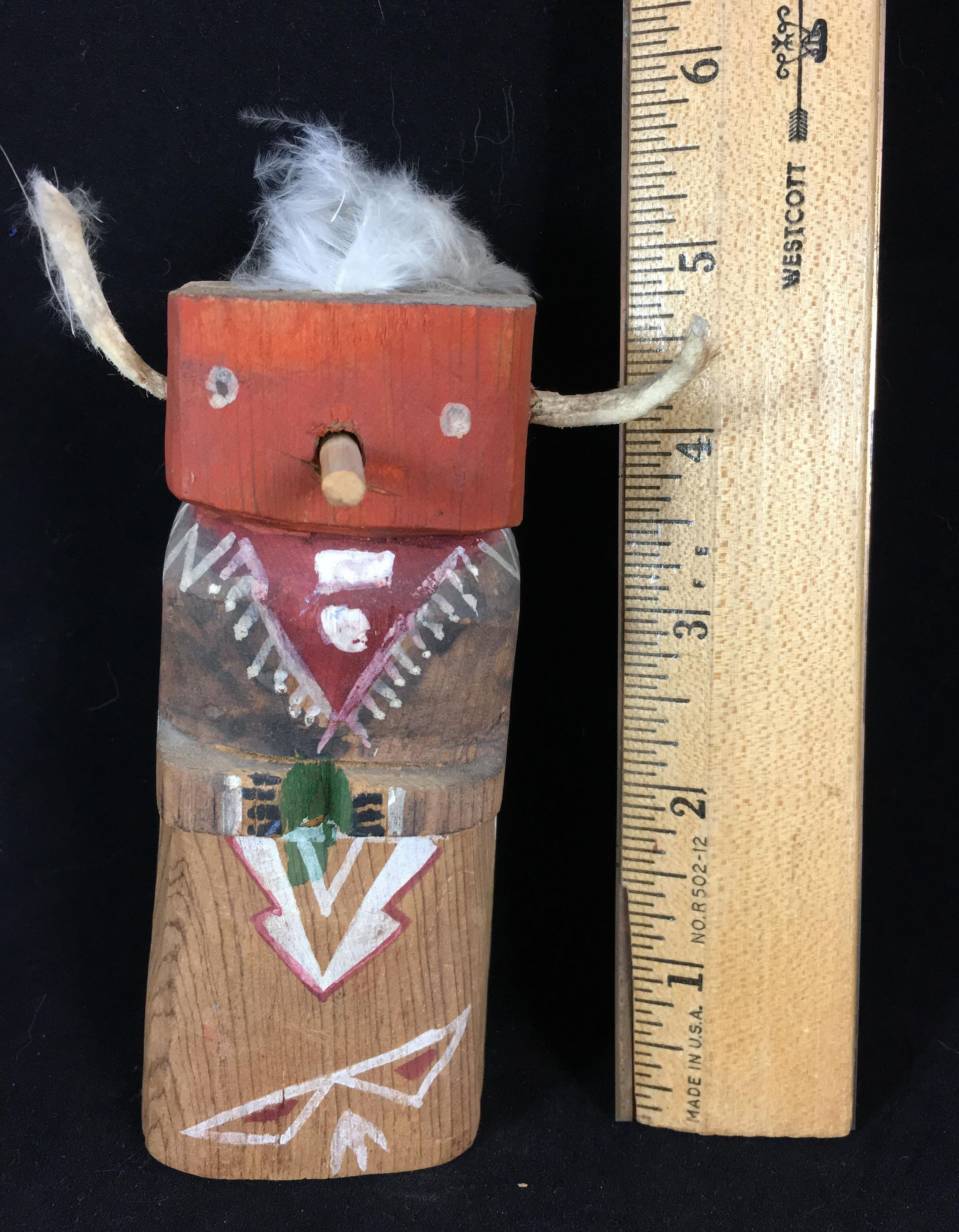 Curious little old tourist “Kachina” (not an actual Hopi Kachina) doll, probably made by people in one of the Rio Grande Pueblos. Made with "horns" made of rawhide which were at one point covered with feathers. In fair shape although the feathers are mostly worn off the "horns" and the top feather is broken.Ethnography