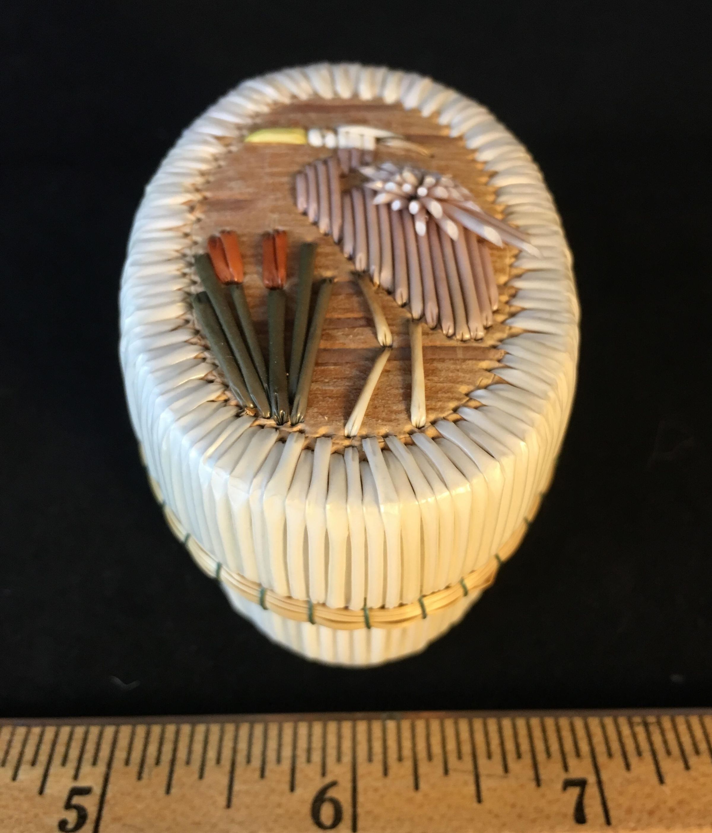 Beautiful little quill box with a heron and cattails on the lid. Bought at the Ojibwe Cultural Foundation on Manatoulin Island, but the maker is from Shawanaga First Nation on the east shore of Georgian Bay.Made/Created