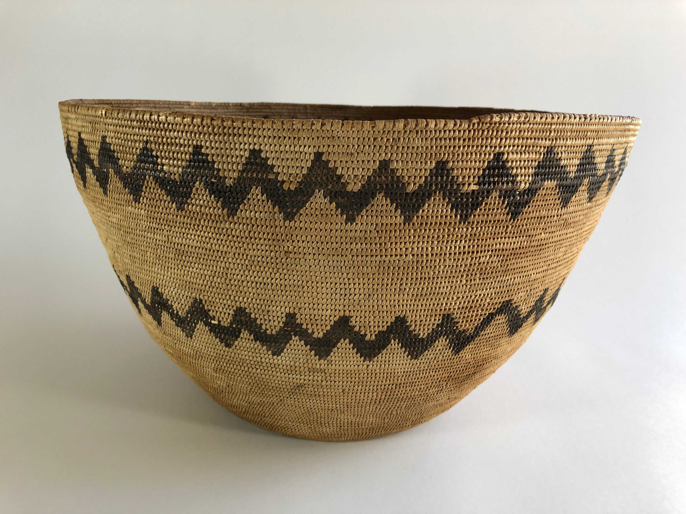 Great cooking basket decorated with two zig zag bands of bracken fern. It has lots of interior wear from cooking. There are many native repairs in the base as well as some repairs in the rim stitching.