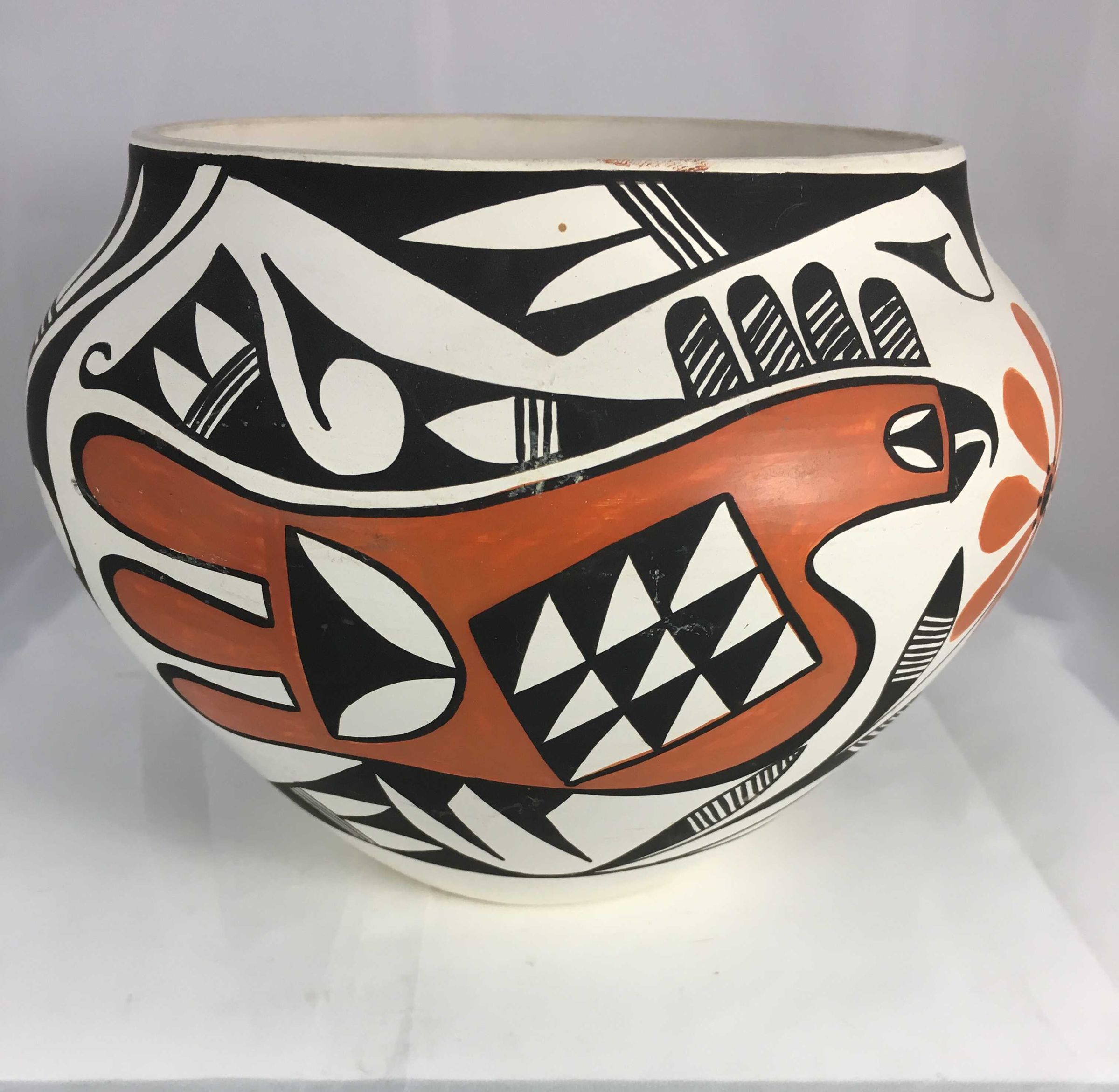 Contemporary polychrome Acoma pot with classic bird and flower designs. Orange and black on white.Made/Created