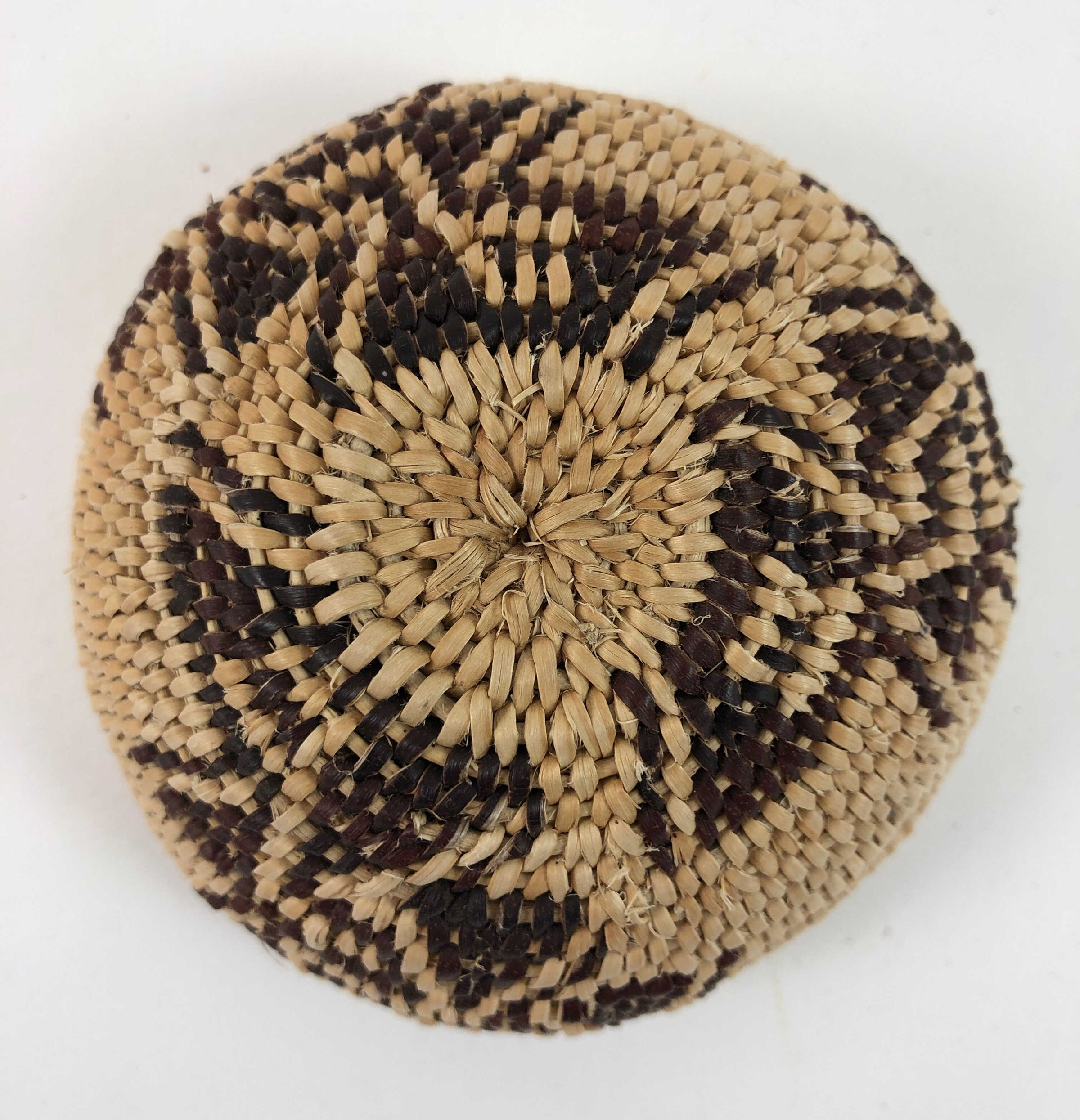 Miniature Maidu basket made by noted weaver Denise Davis in 2016. Decoration is a set of triangles and lines in redbud repeated three times extending from about the fourth coil from the start to two coils below the rim.