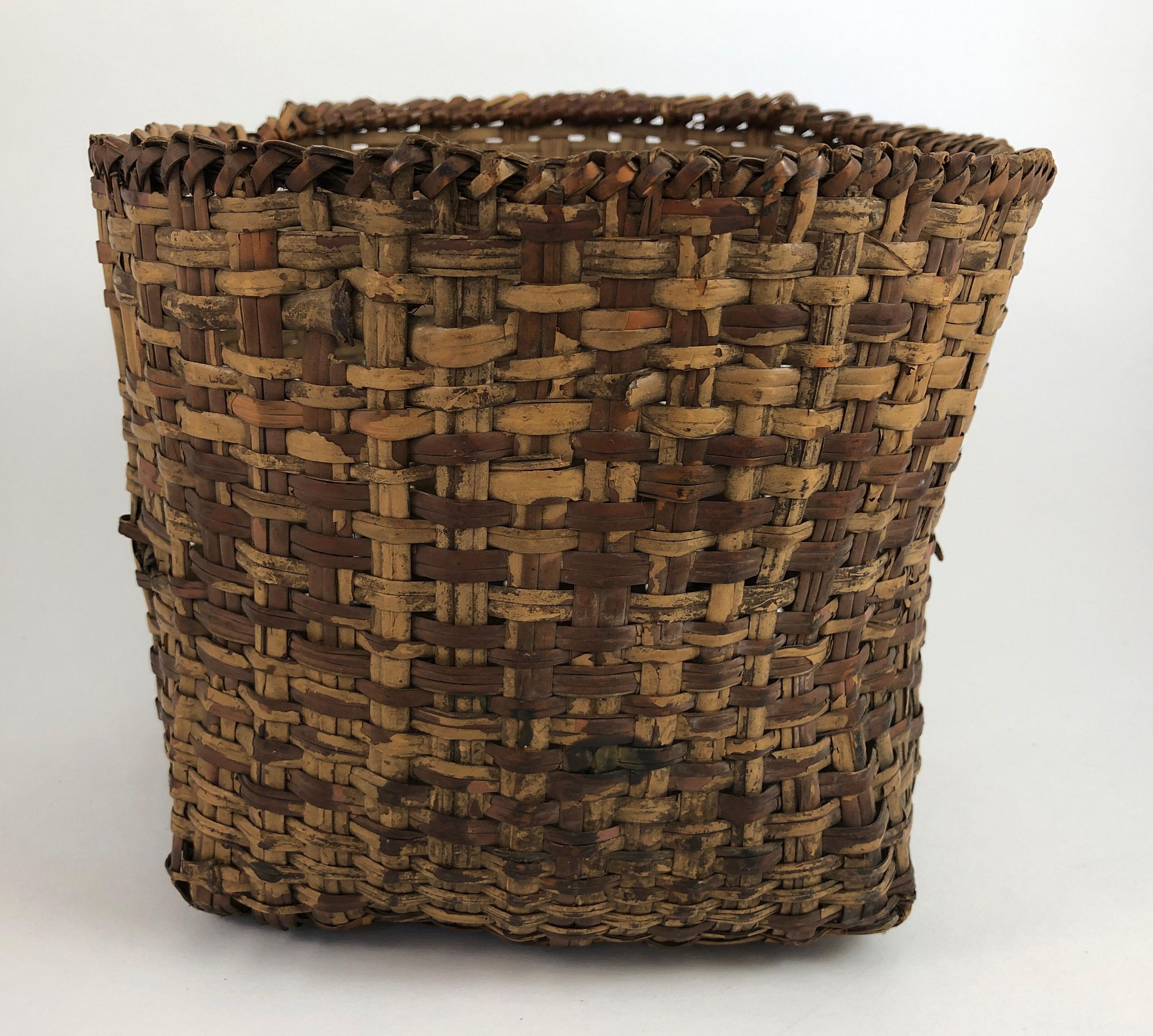 Old southeast split cane basket, well used but still in great shape. The plaited base is square but the basket becomes round as it continues up. My best guess is Cherokee.