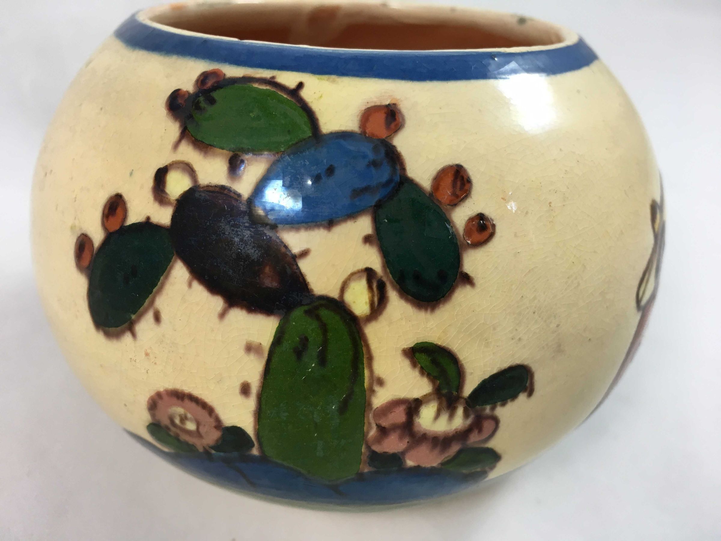 Small spherical cream-colored Tlaquepaque bowl depicting a large nopal cactus, a person wearing a lumpy sweater or shirt and a sombrero walking away from the cactus towards two containers (?), with additional cactuses in the far right. The back of the pot has no design. There is a blue line around the rim.Inscription/Signature/Marks