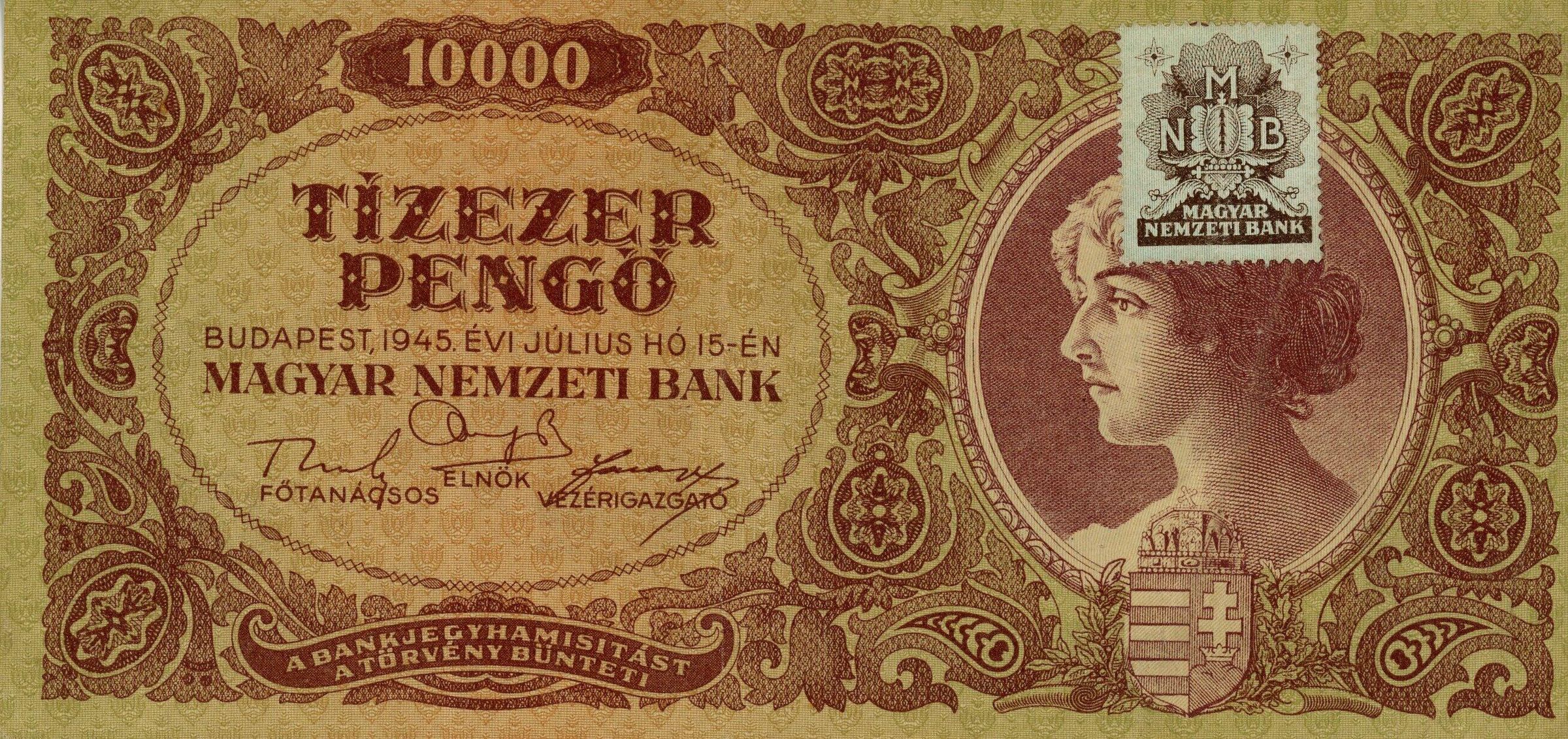 Portrait woman at right. Hungarian coat of arms below portrait. Adhesive stamp from the Hungarian National Bank affixed above the portraitTranscription