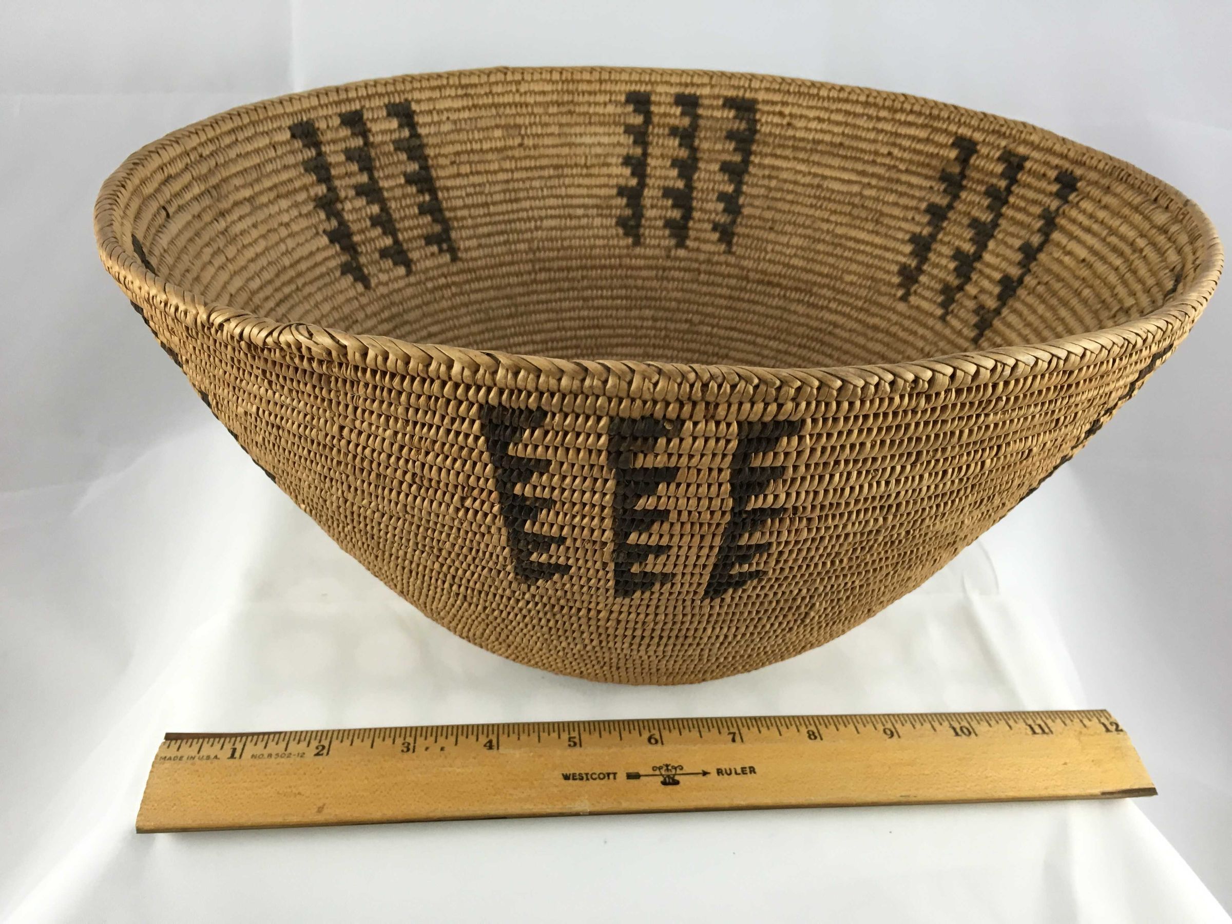 Paiute bowl with an almost austere decoration consisting of six sets of three lines of five stepped triangles each, and the unusual inclusion of two spots of dark stitching in the base. It is in essentially perfect condition.