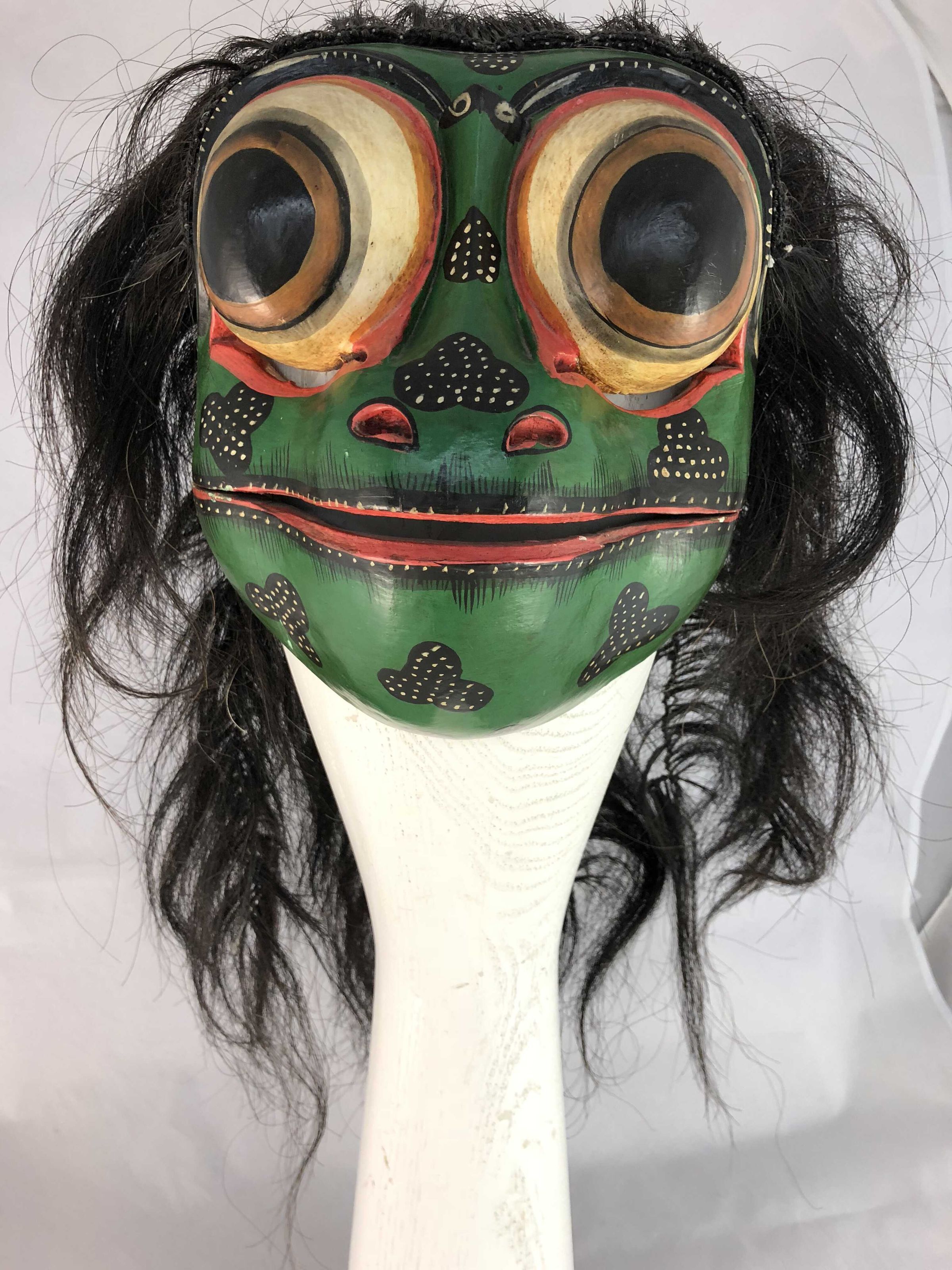 Large carved wooden mask with the face of a frog sporting long hair. The frog's jaw is a second piece attached with small leather hinges. The mask has a hood of plaited bamboo slats covered with black cloth.