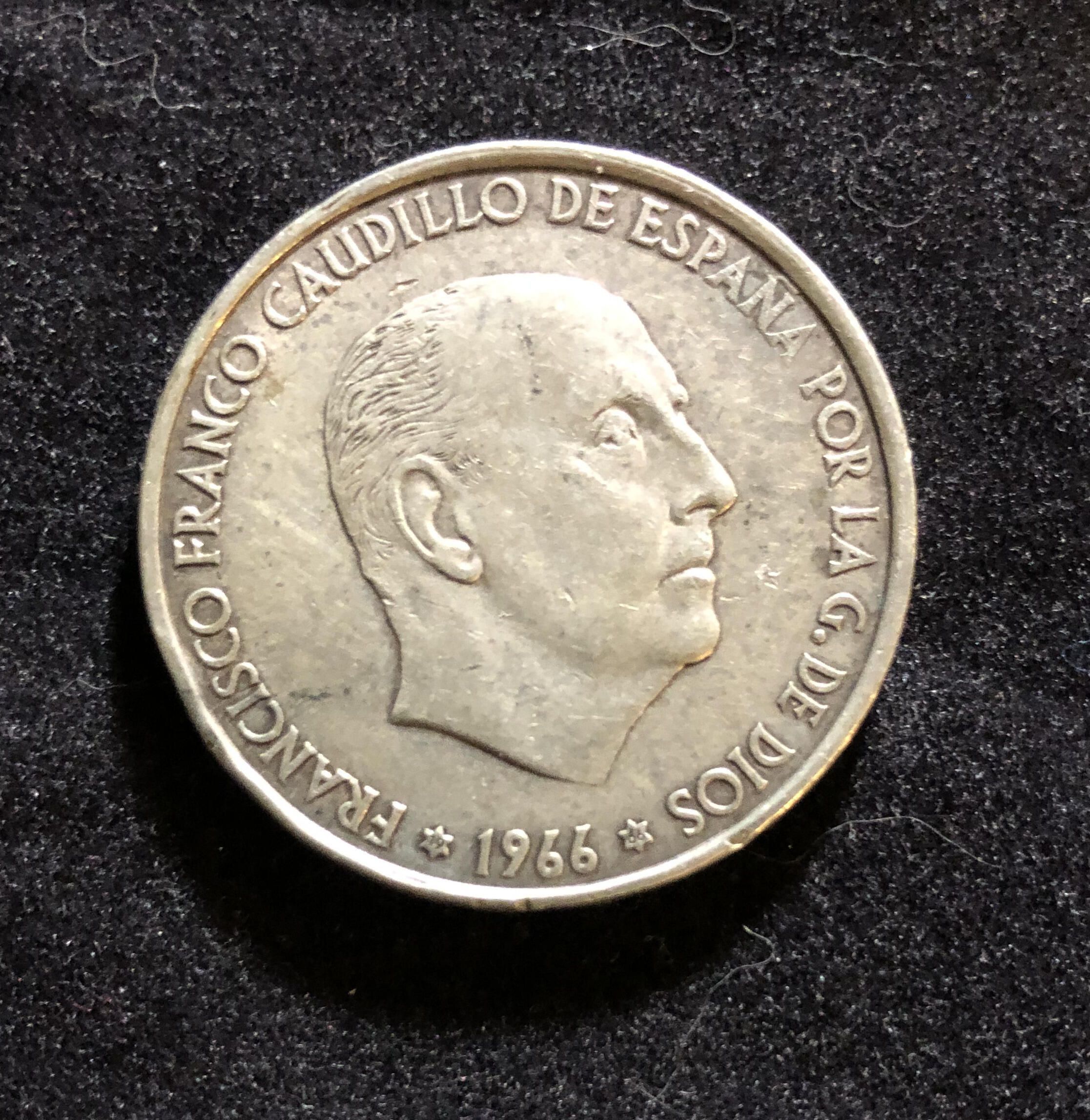 Spanish 100 peseta coin featuring the profile of the dictator Francisco Franco, dated 1966