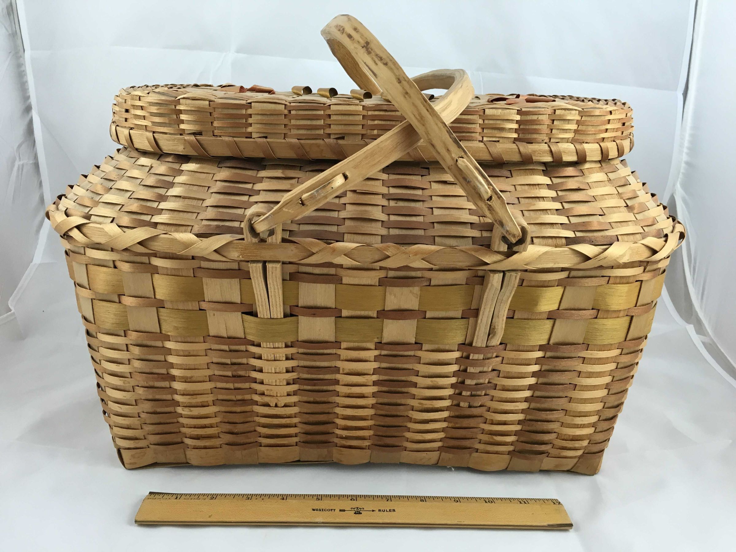 Large, sturdy picnic basket made by weaver Margaret Decorah of Wisconsin Dells in 1972 at the age of 84. It is in excellent condition, other than fading of the dyed splints on the exterior and a couple of small, probably water, stains on the lid. Superbly made carved, bent handles.Made/Created