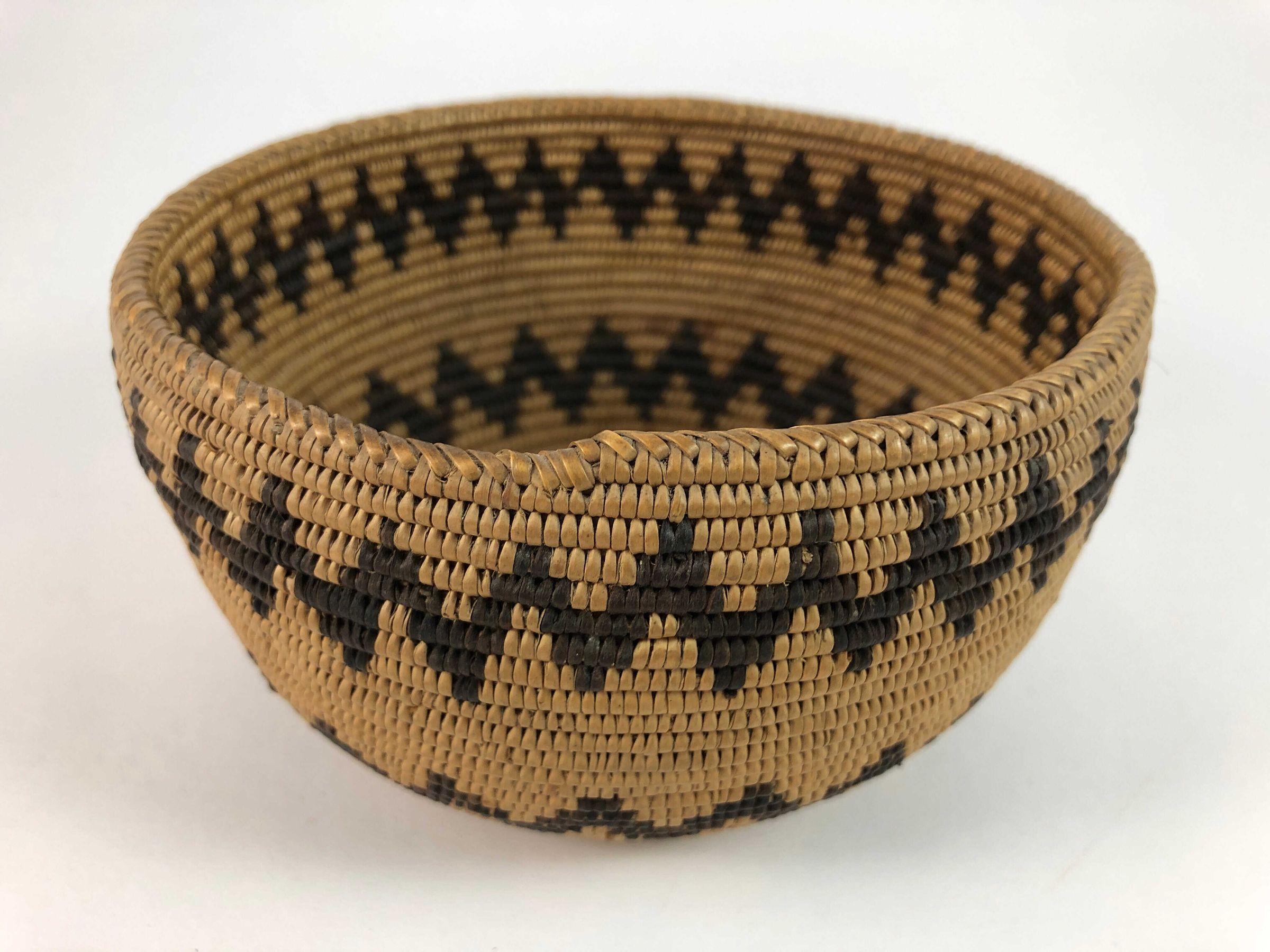 Small bowl shaped basket in pretty near perfect condition made of willow and decorated with two rows of bracken fern zig-zags. Three rod foundation. Extremely well made.