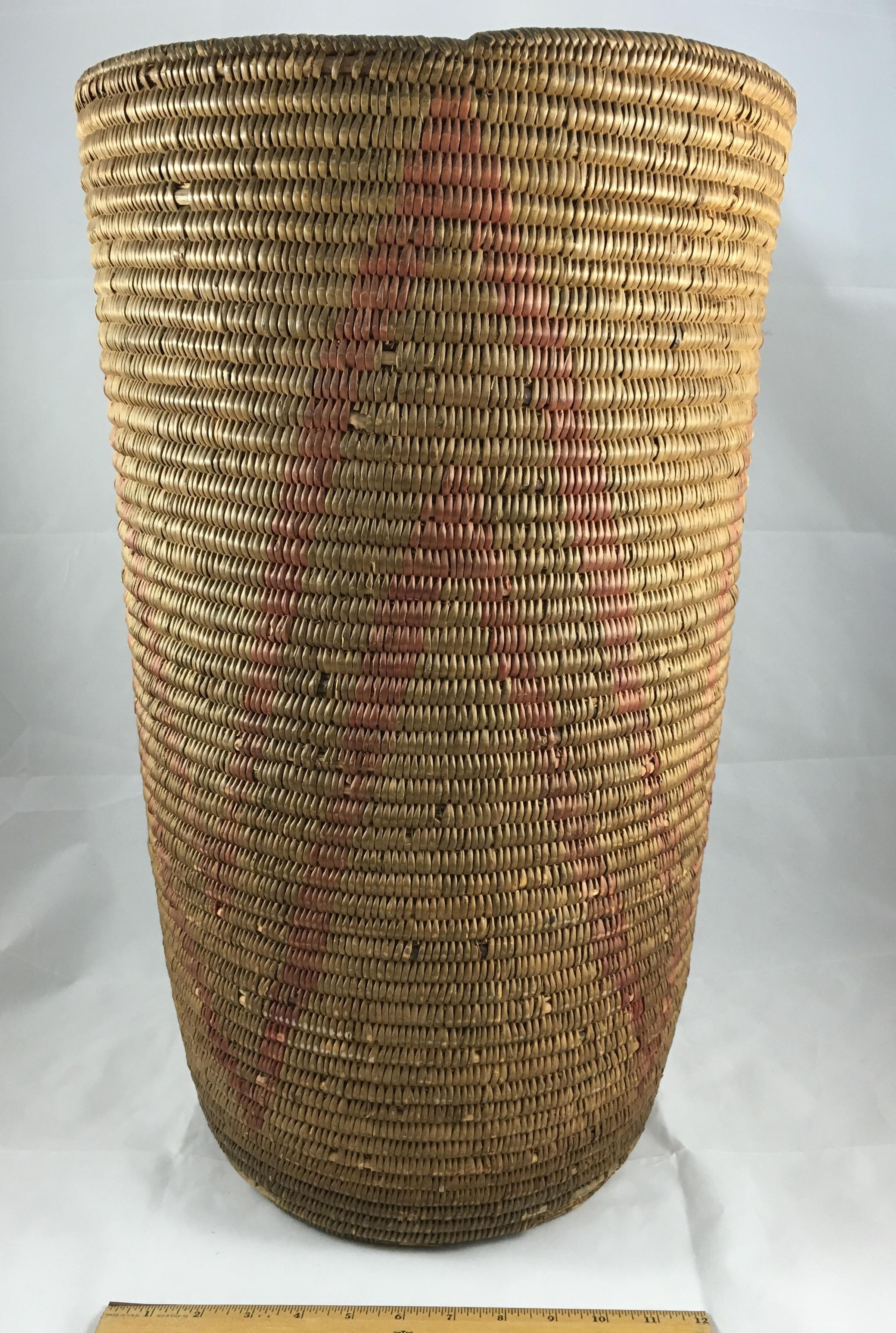 This is a very large, sturdy basket. There is evidence of it having been used. Typical for Jicarilla baskets, the design is faded but certainly still visible, particularly on the inside.