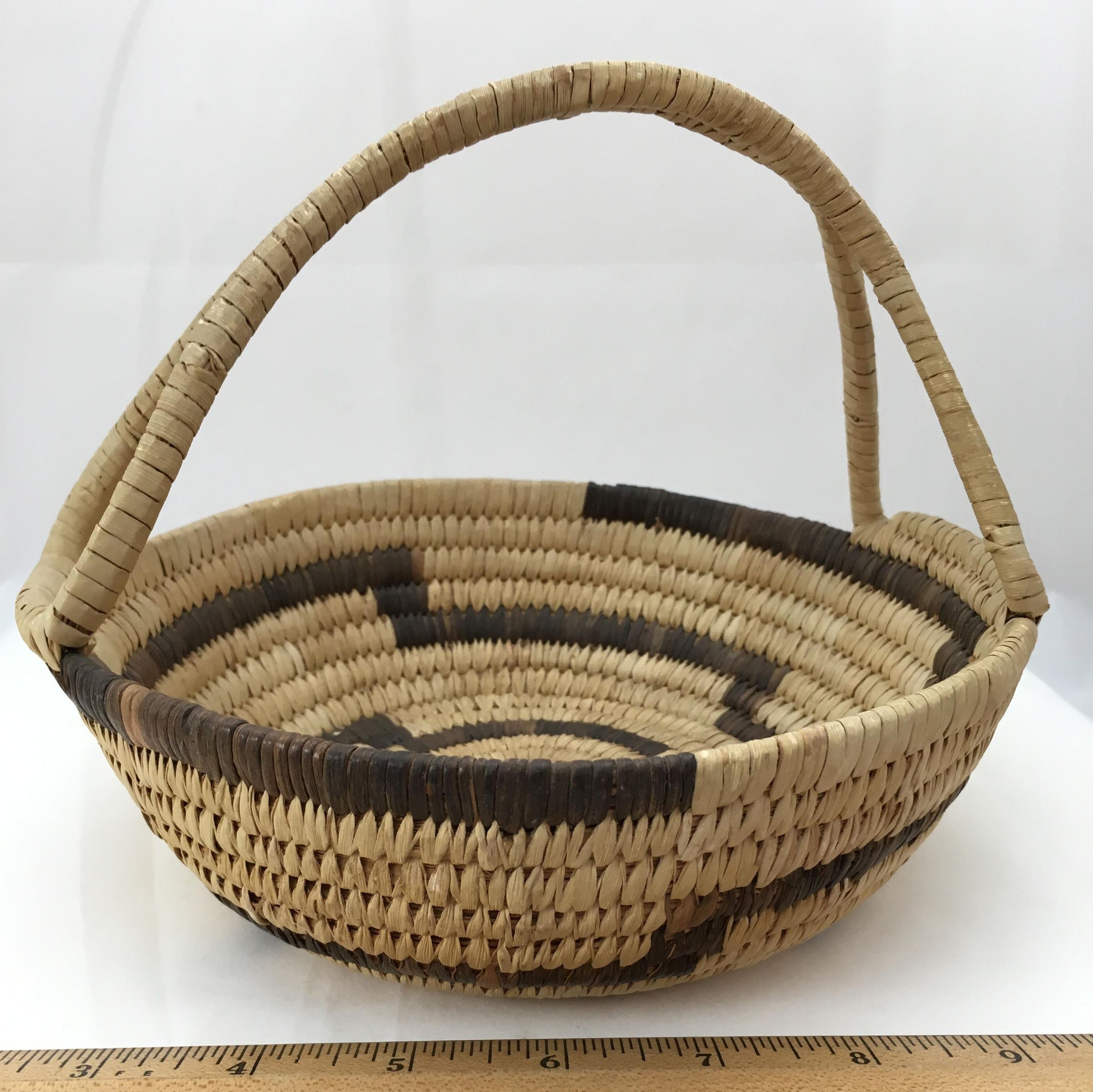 A small Tohono O'Odham handled basket decorated with two stepped line devil's claw lines extending up from near the start to the rim.