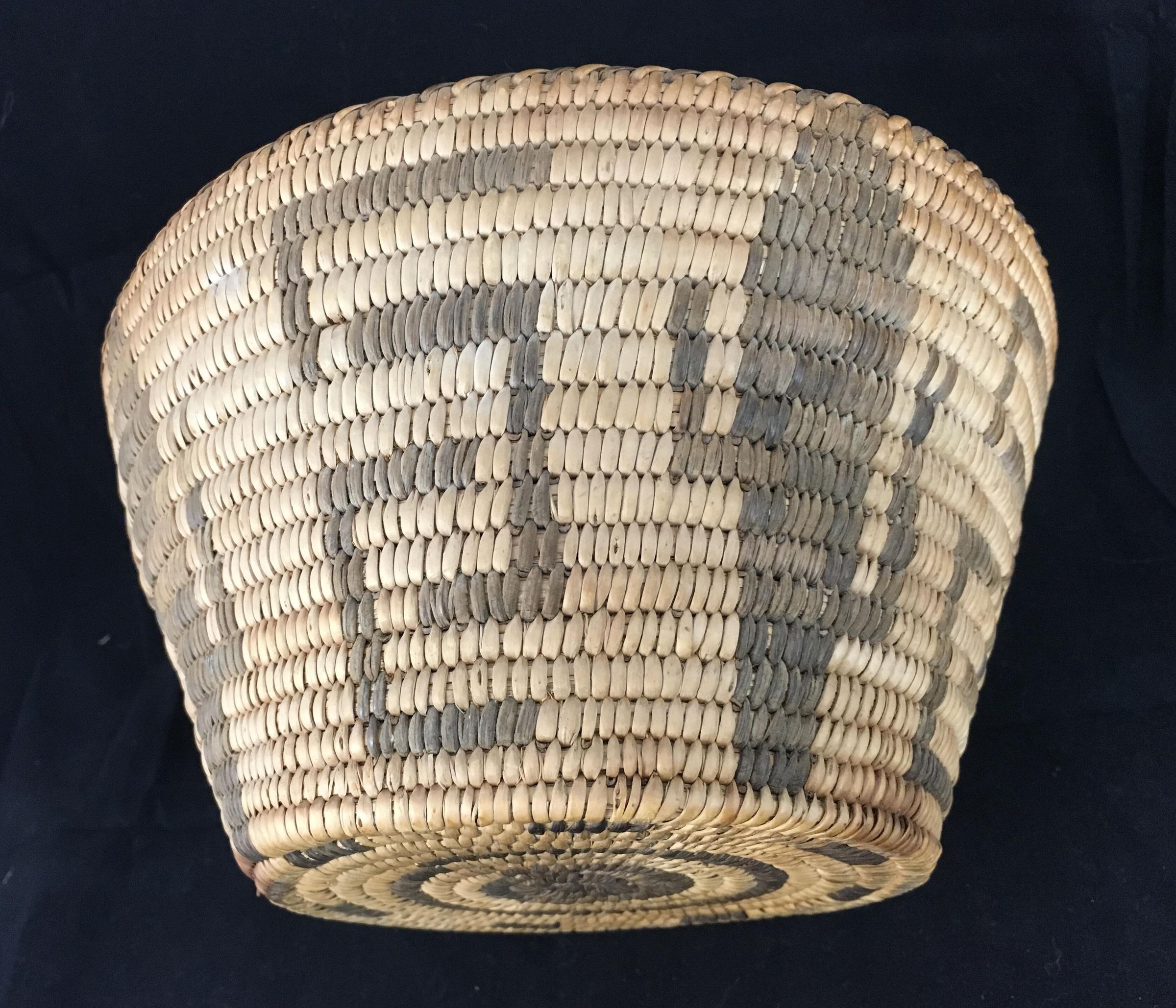 Nice little Pima basket. Very sturdy, in excellent shape, aside from a small stain and a couple of missing stitches on the bottom. Beautiful rim with alternating devil's claw and willow stitches.