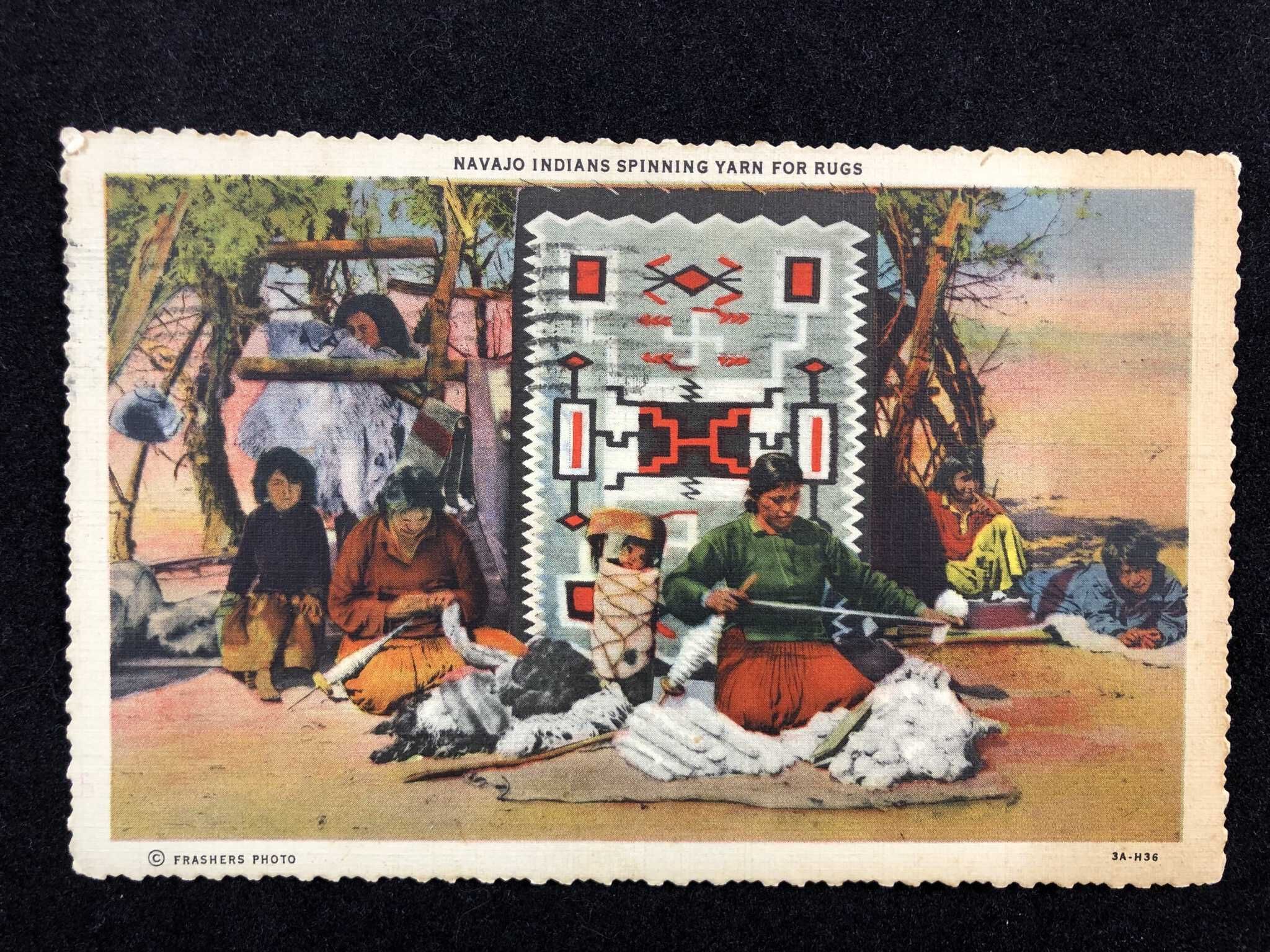 Navajo family seated around a storm pattern rug. Two women in the foreground are processing wool into yarn. A baby in a cradleboard is leaning against the rug between them. Two children are on the right side, one seated and the other laying on the ground. Another is standing on the left. Another woman is visible standing in the left background behind what is possibly a hanging sheepskin.Subject
