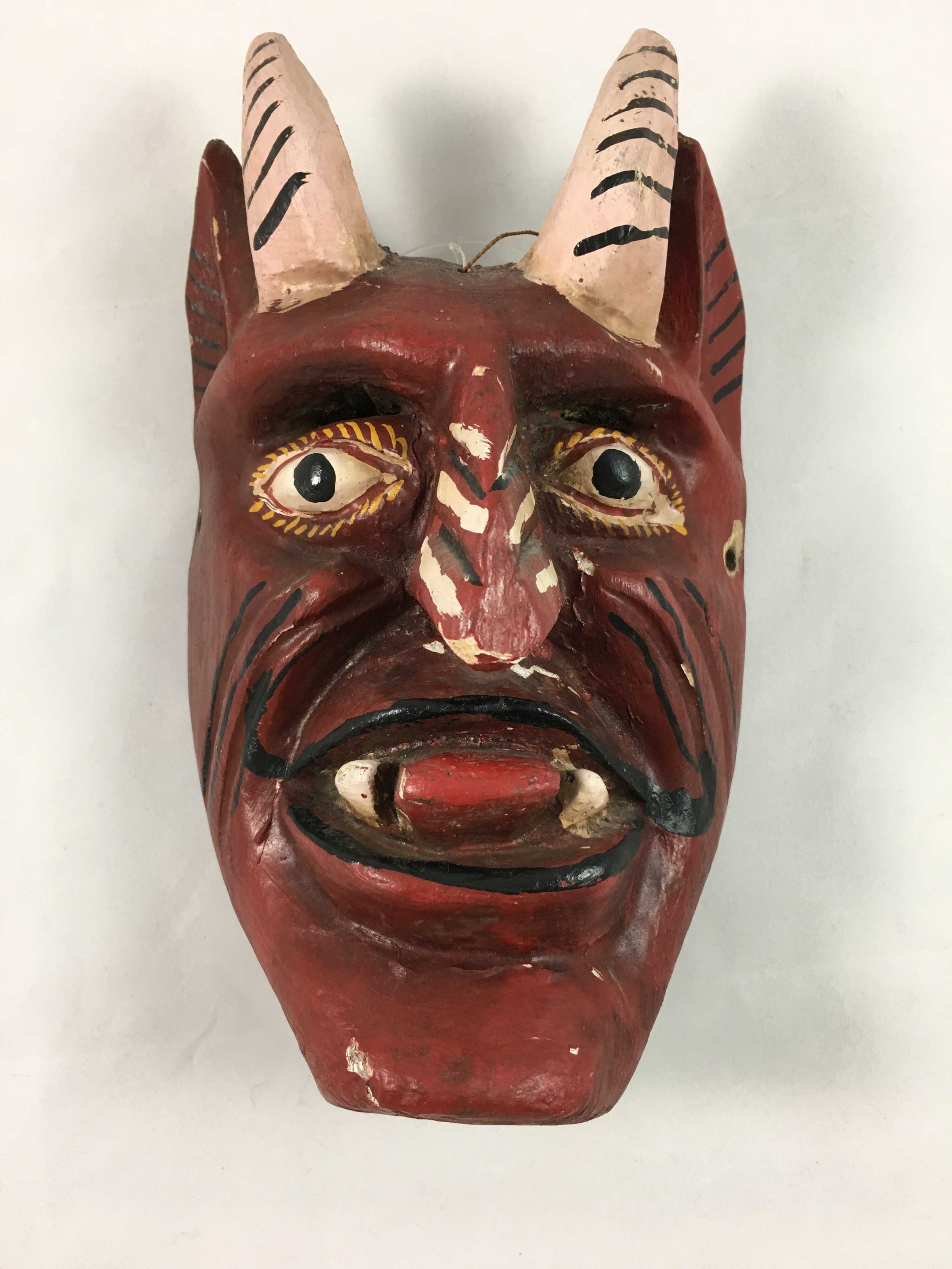 Small devil mask with carved horns, and a protruding tongue with one tooth protruding on either side. The face is primarily painted red, with black lines emphasizing the lines on either side of the mouth, as well as black diagonal lines on the ears and on the pink painted horns, and black and white diagonal lines on the nose. The eyes have yellow painted eyelashes, and large black irises on white backgrounds.Material