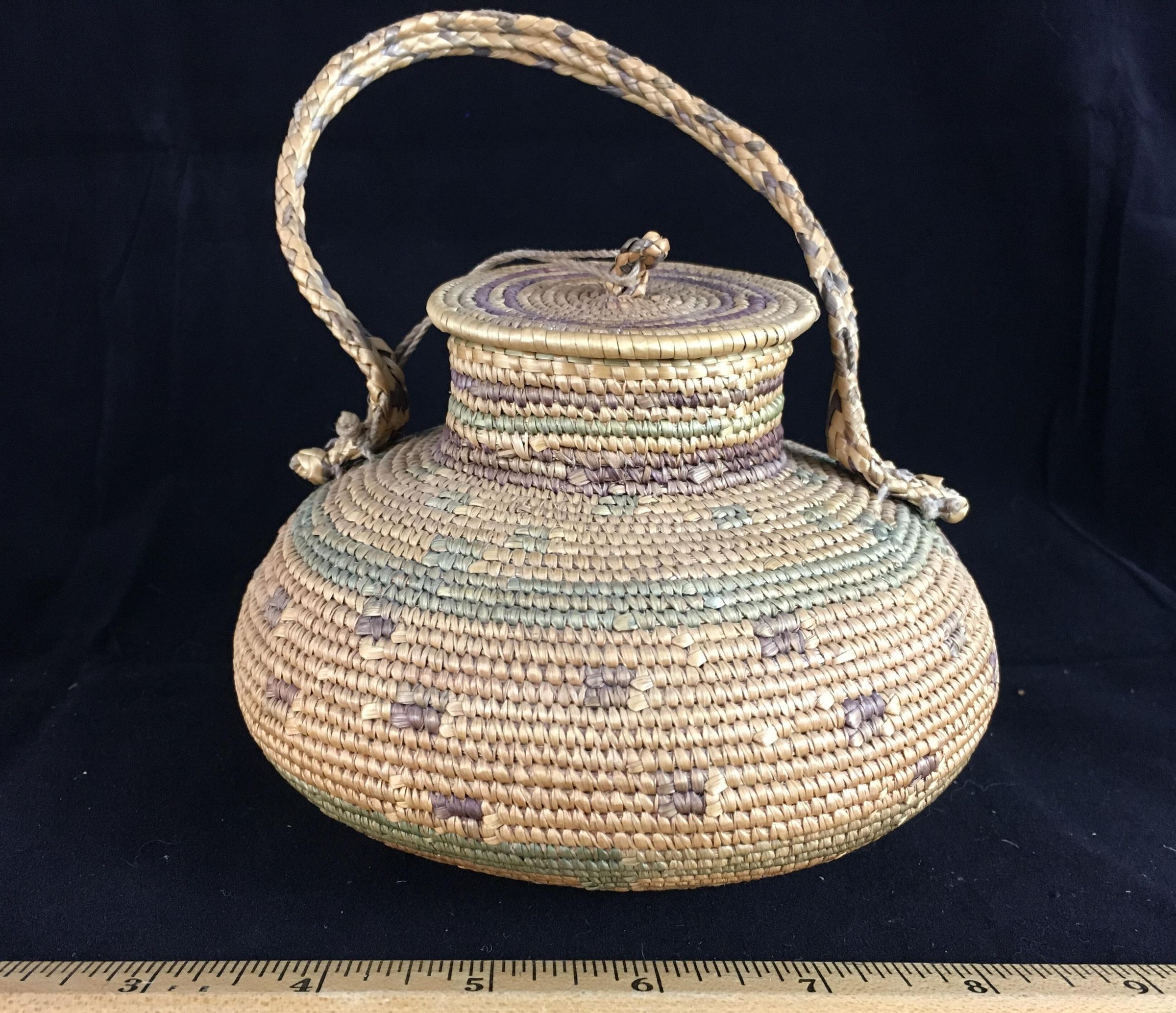 Great little basket in perfect condition aside from expected fading of the color on the exterior. The lid is attached to the basket at one end of the basketry handle with cotton thread. The start of the basket is a basketry loop made with natural and purple grass.