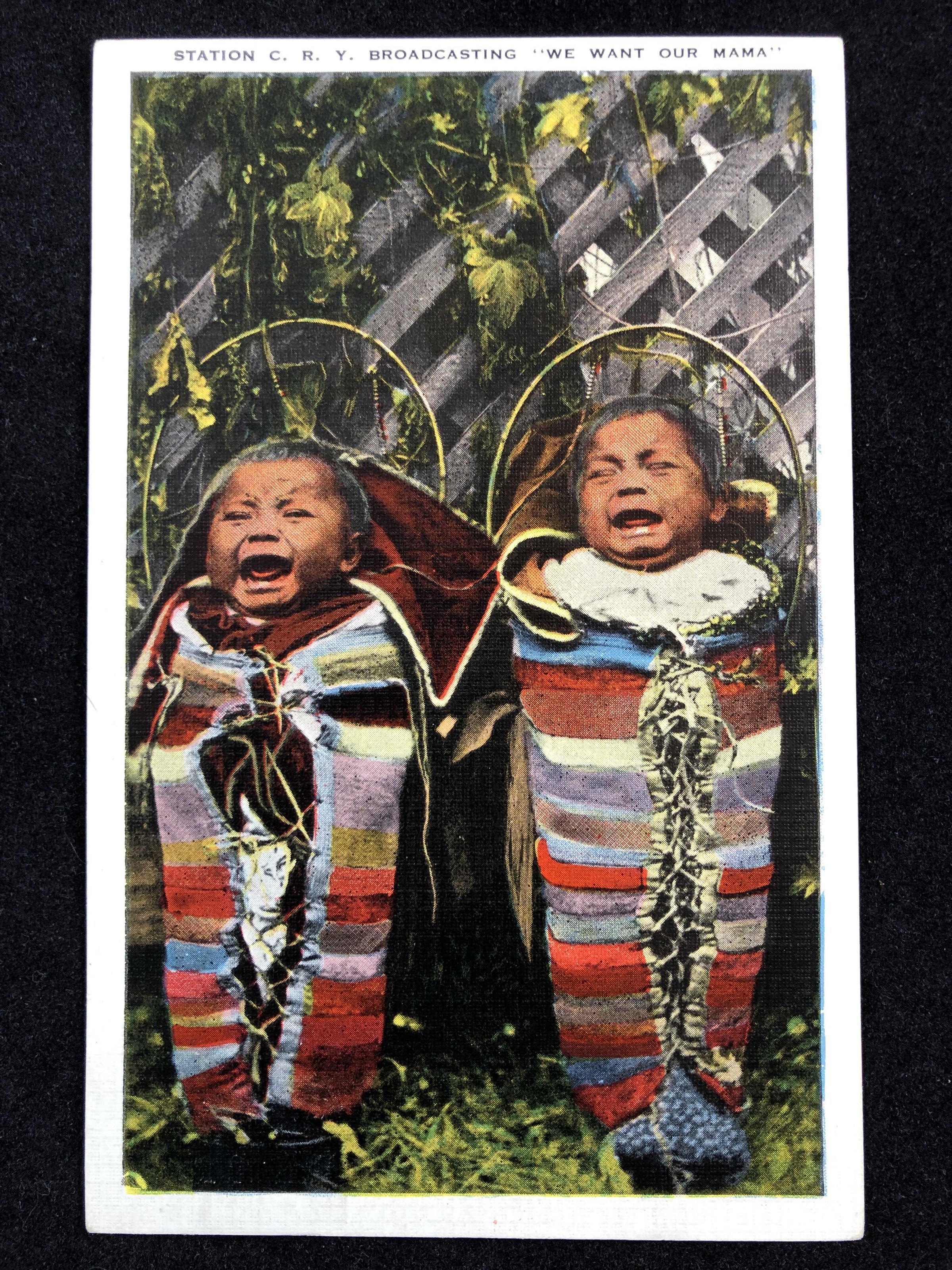 Two crying Native American babies, each swaddled in a cradleboard, leaning against a latticework.Subject
